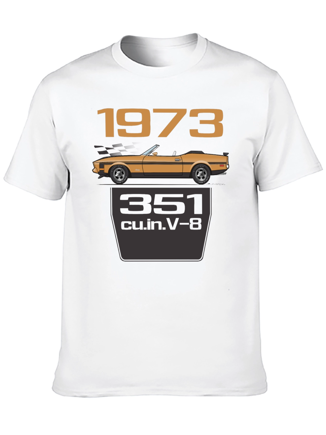 Show off your love for classic American muscle with this stylish black t-shirt! The shirt features a vintage 1973 Ford Mustang convertible design, complete with the iconic '351 cu.in. V-8' engine specification. The retro graphic gives it a cool, nostalgic feel. Made from comfortable, breathable fabric, this t-shirt is perfect for everyday wear. Whether you're a car enthusiast, a Mustang fan, or just appreciate classic designs, this shirt is a great way to express your style. It's ideal for casual outings, car shows, or simply relaxing at home. A must-have addition to any car lover's wardrobe!