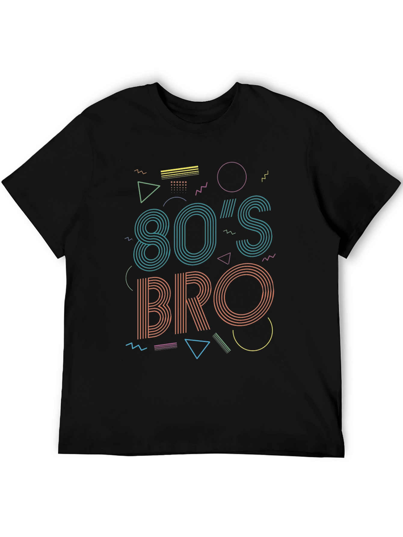 Step back in time with this awesome 80's Bro Graphic Tee! This black t-shirt features a vibrant, retro-inspired design. The words "80'S BRO" are prominently displayed in a colorful, multi-lined font, accented with geometric shapes like triangles, circles, and zigzags, giving it that iconic 80's flair. Made from a soft and comfortable fabric, this tee is perfect for casual wear. Show off your love for the era of neon, big hair, and rad tunes. Great for parties, casual hangouts, or just expressing your unique style. Get yours today and let the good times roll!