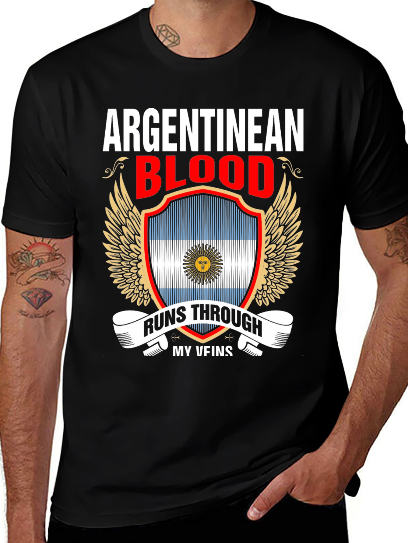 Show off your Argentine pride with this bold graphic t-shirt. The design features the words "Argentinean Blood" above a stylized Argentine flag shield with golden wings. Below, a ribbon reads "Runs Through My Veins". Made from comfortable, breathable cotton, this tee is perfect for everyday wear or to celebrate your heritage at sporting events, family gatherings, or cultural festivals. The eye-catching design and comfortable fit make it a must-have for any proud Argentinean.