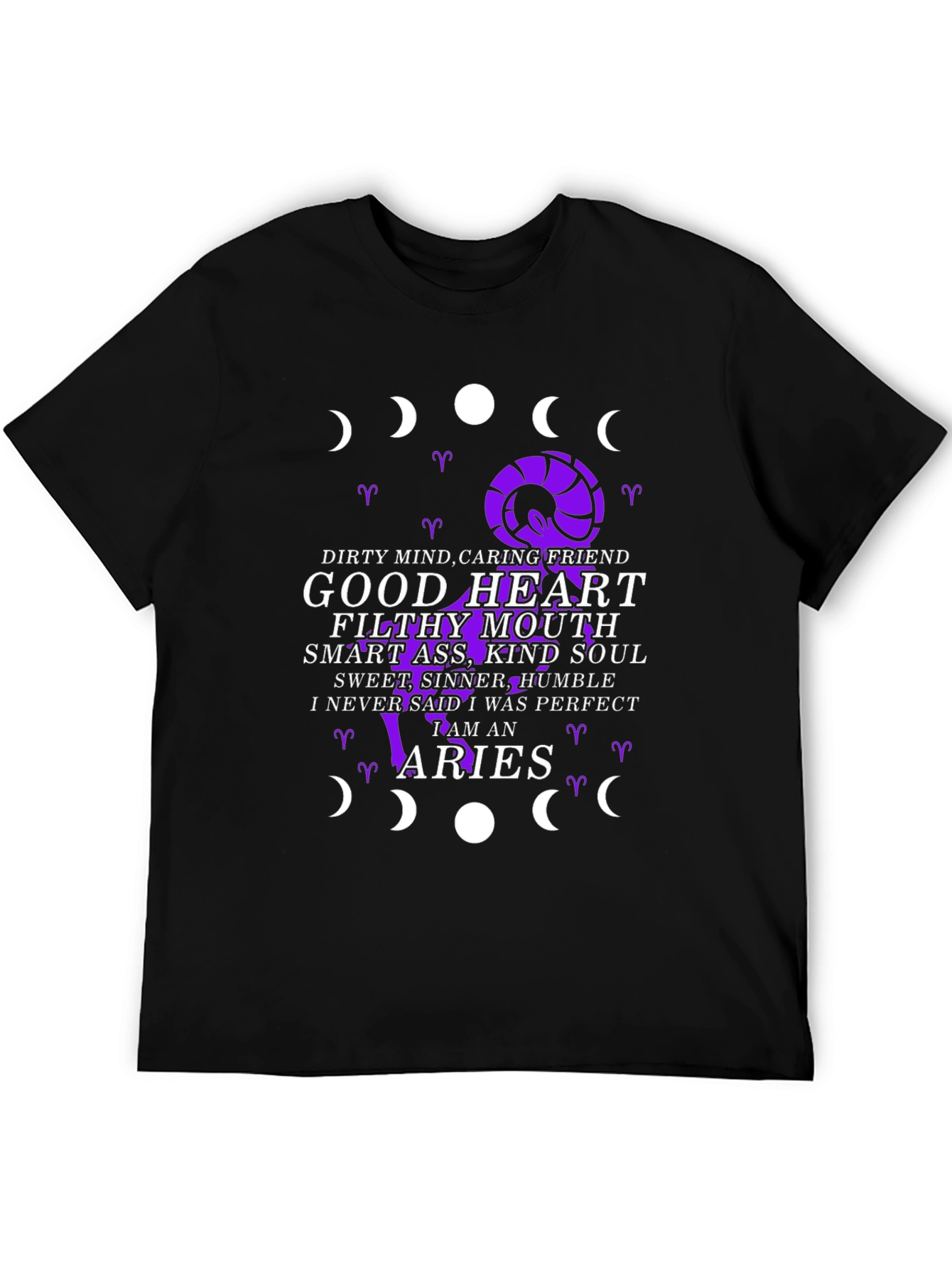 Express your zodiac sign with this eye-catching Aries t-shirt! This black tee features a humorous and bold design with text that reads "Dirty Mind, Caring Friend, Good Heart, Filthy Mouth, Smart Ass, Kind Soul, Sweet, Sinner, Humble, I Never Said I Was Perfect, I Am An Aries". The graphic incorporates Aries symbols and lunar phases for a stylish touch. This shirt is perfect for casual wear, astrology lovers, or anyone with a fiery Aries spirit. Show off your unique personality with this comfortable and trendy tee!