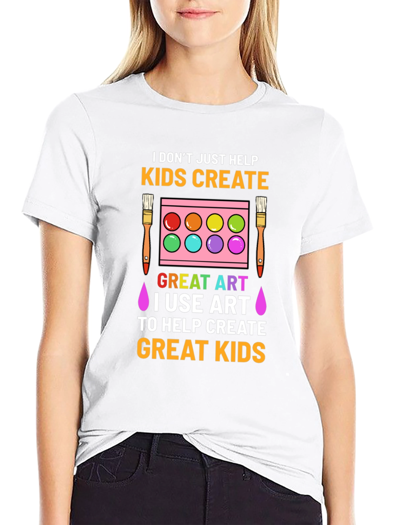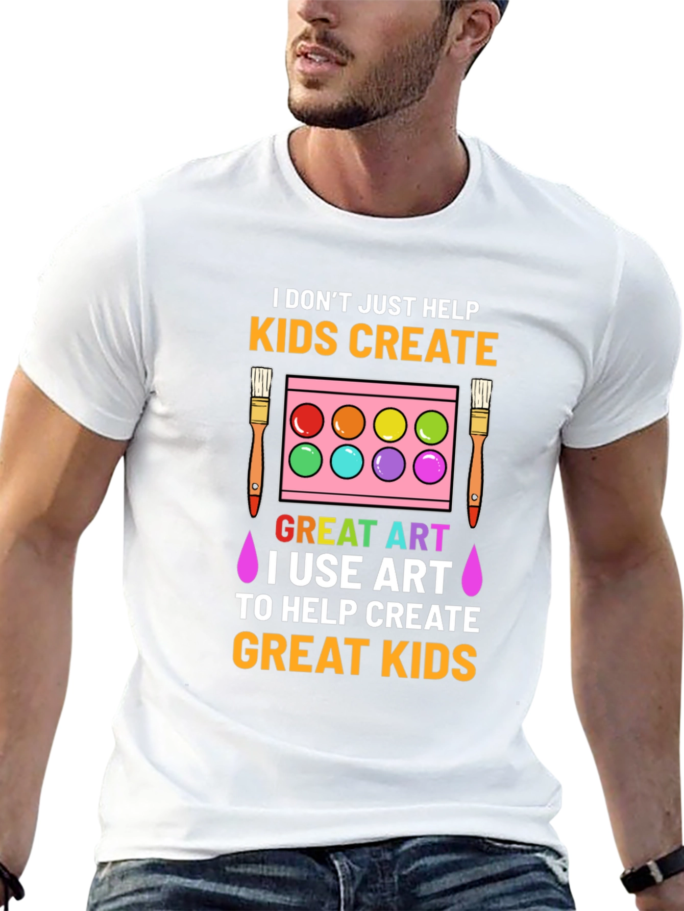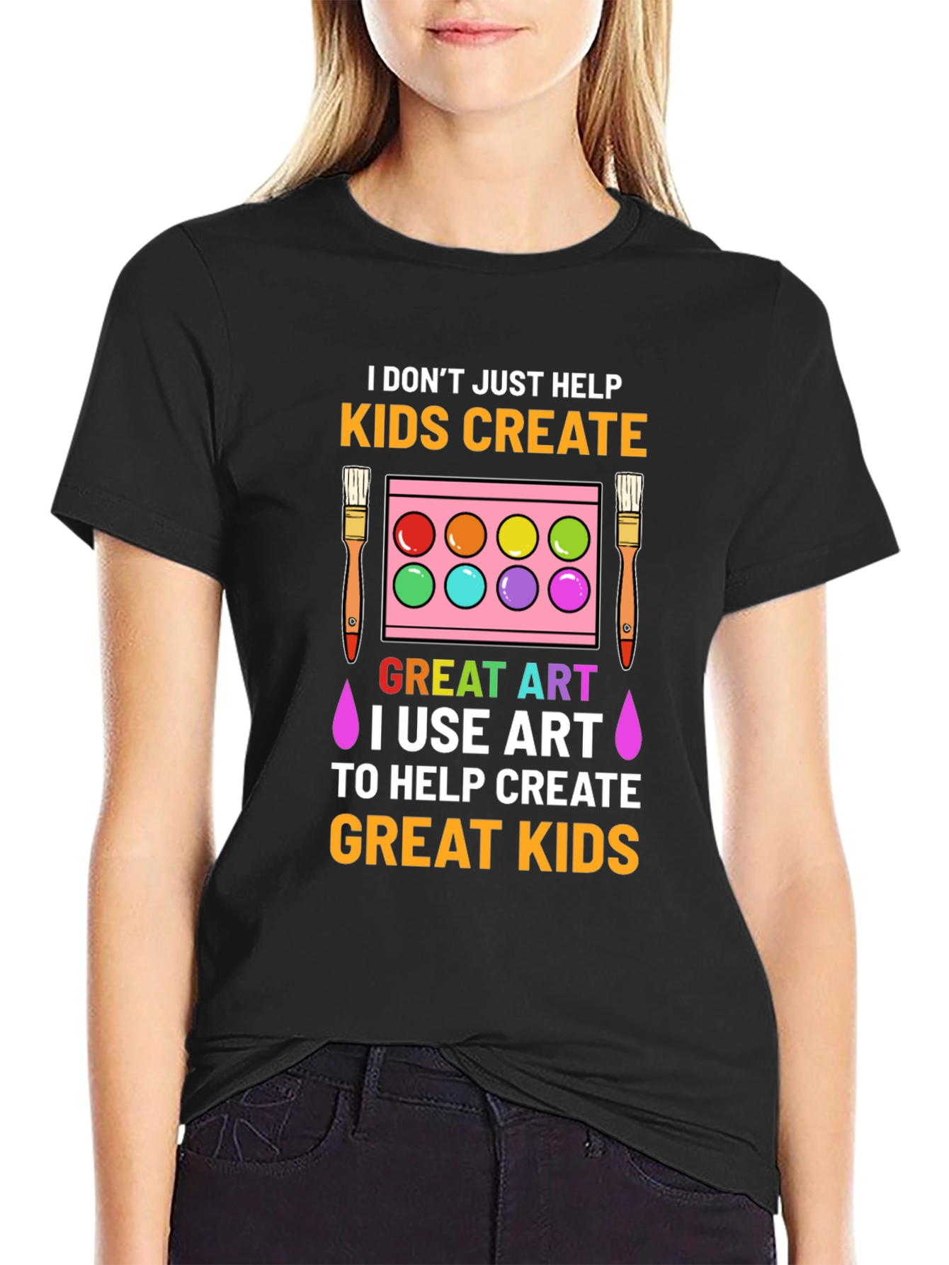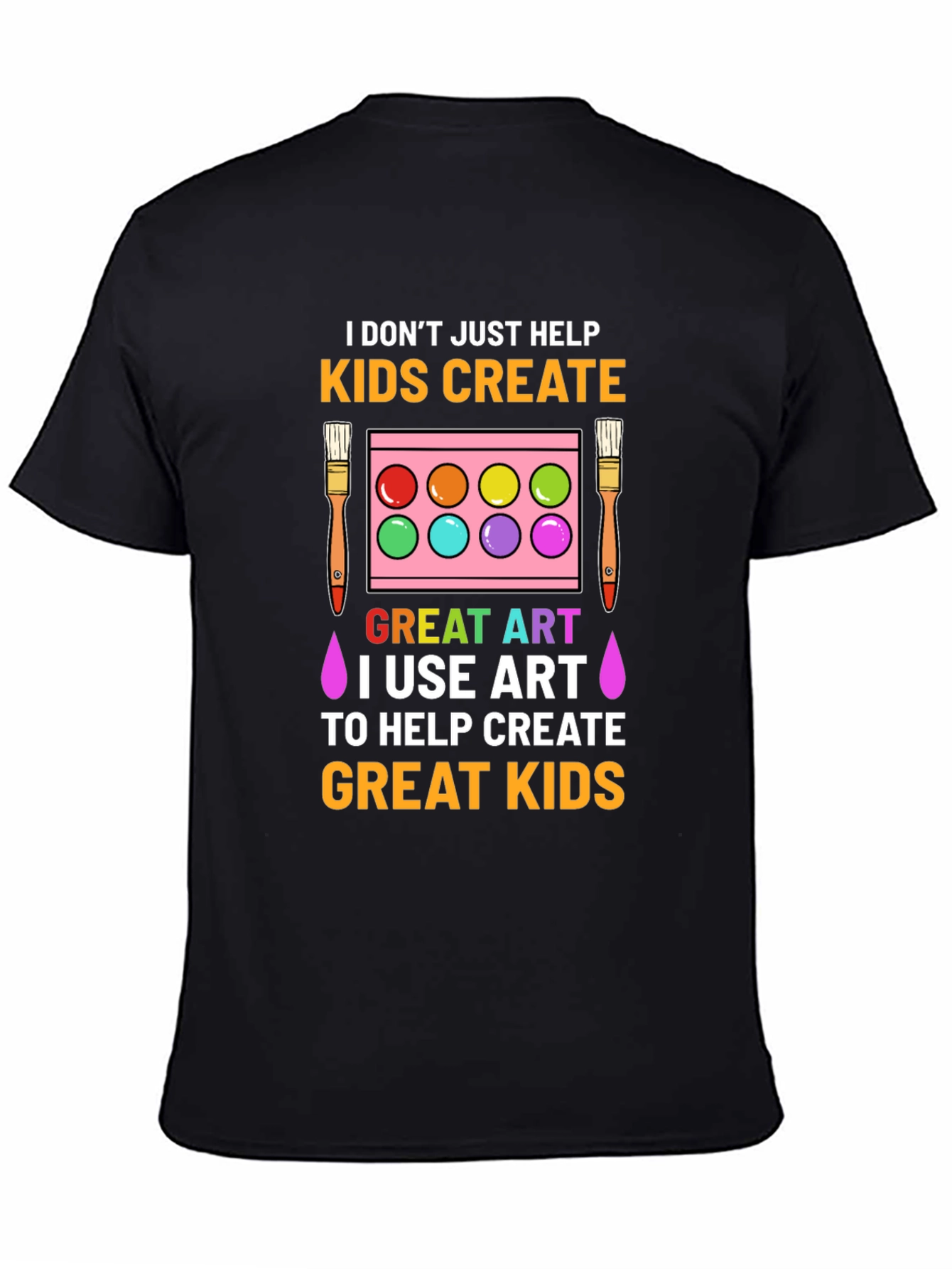 Show your passion for art and teaching with this unique black T-shirt! Featuring a vibrant graphic design with an artist's palette and brushes, it proudly proclaims, "I don't just help kids create great art; I use art to help create great kids." This tee is perfect for art teachers, parents, or anyone who believes in the power of creativity. Made from comfortable, breathable fabric, it’s ideal for everyday wear, art classes, or casual outings. Let your shirt spark conversations and inspire others with your dedication to nurturing young artists! Wear your heart on your sleeve (or rather, your chest!) and spread the joy of art.