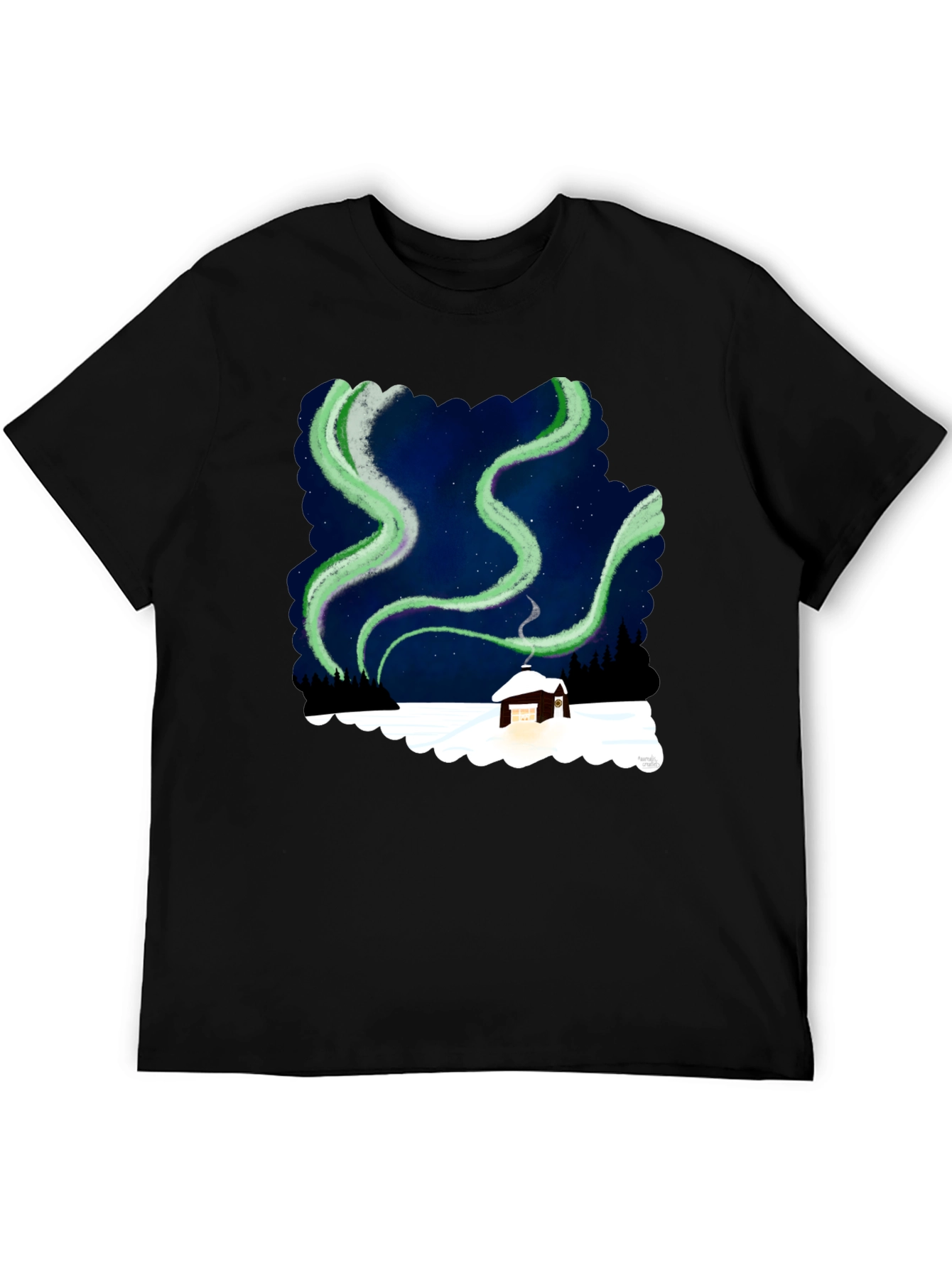 Embrace the magic of the Northern Lights with this unique black t-shirt. Featuring a captivating design of a cozy cabin nestled in a snow-covered landscape under the shimmering aurora borealis, this tee brings a touch of winter wonder to your wardrobe. The design includes vibrant green and purple hues that create a stunning visual effect against the night sky. Made from comfortable, breathable fabric, this t-shirt is perfect for casual wear, outdoor adventures, or cozy nights in. Stand out with this eye-catching, nature-inspired piece that's sure to spark conversation.