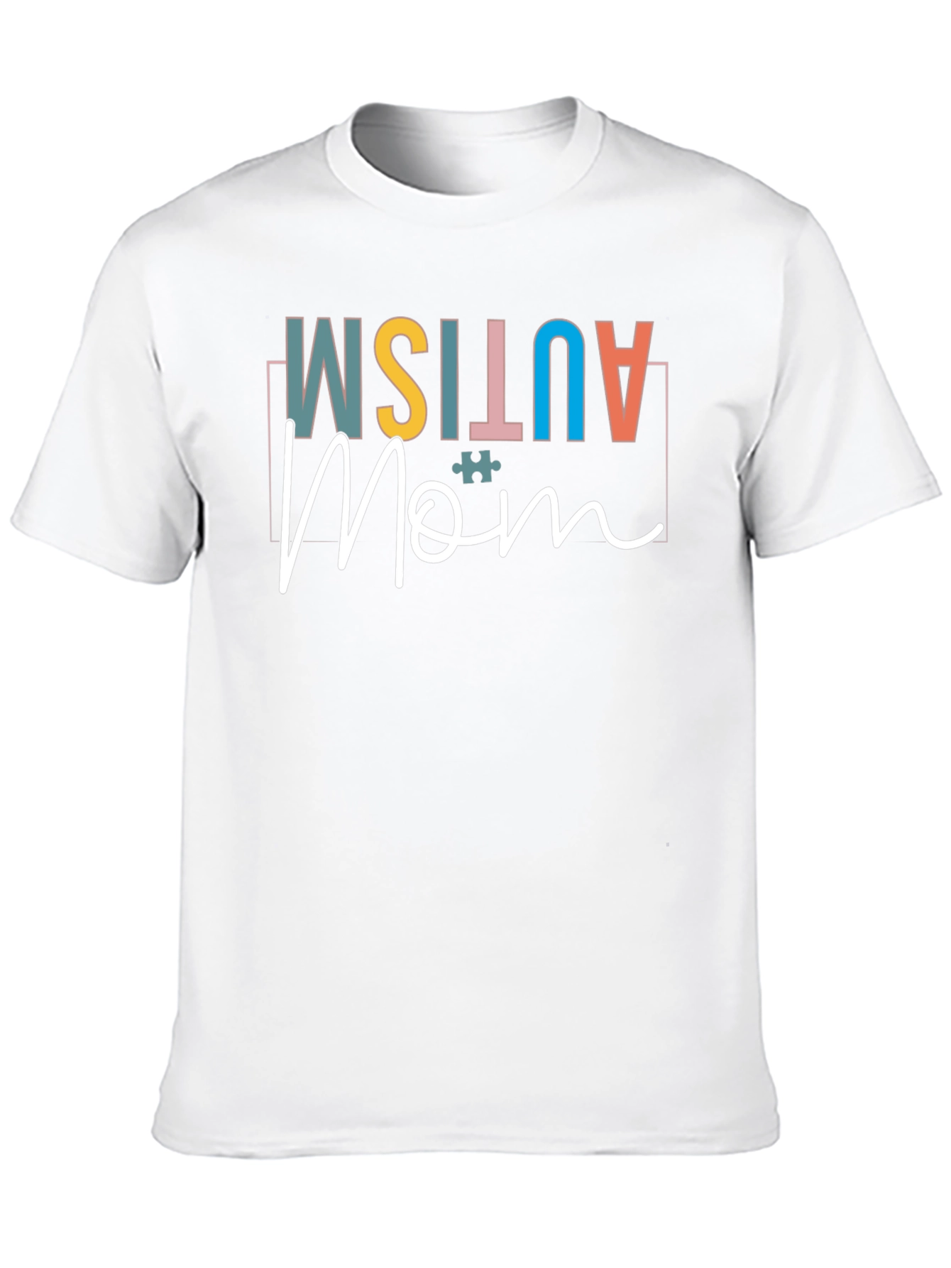 Show your support with this black graphic tee. The design features the word 'AUTISM' stacked vertically in bright, individual block letters in various colors. Below that, the word 'Mom' is written in cursive, with a puzzle piece incorporated into the design. The t-shirt itself appears to be a comfortable, everyday style, ideal for casual wear or autism awareness events. Make a statement while supporting a great cause with this stylish and meaningful tee.