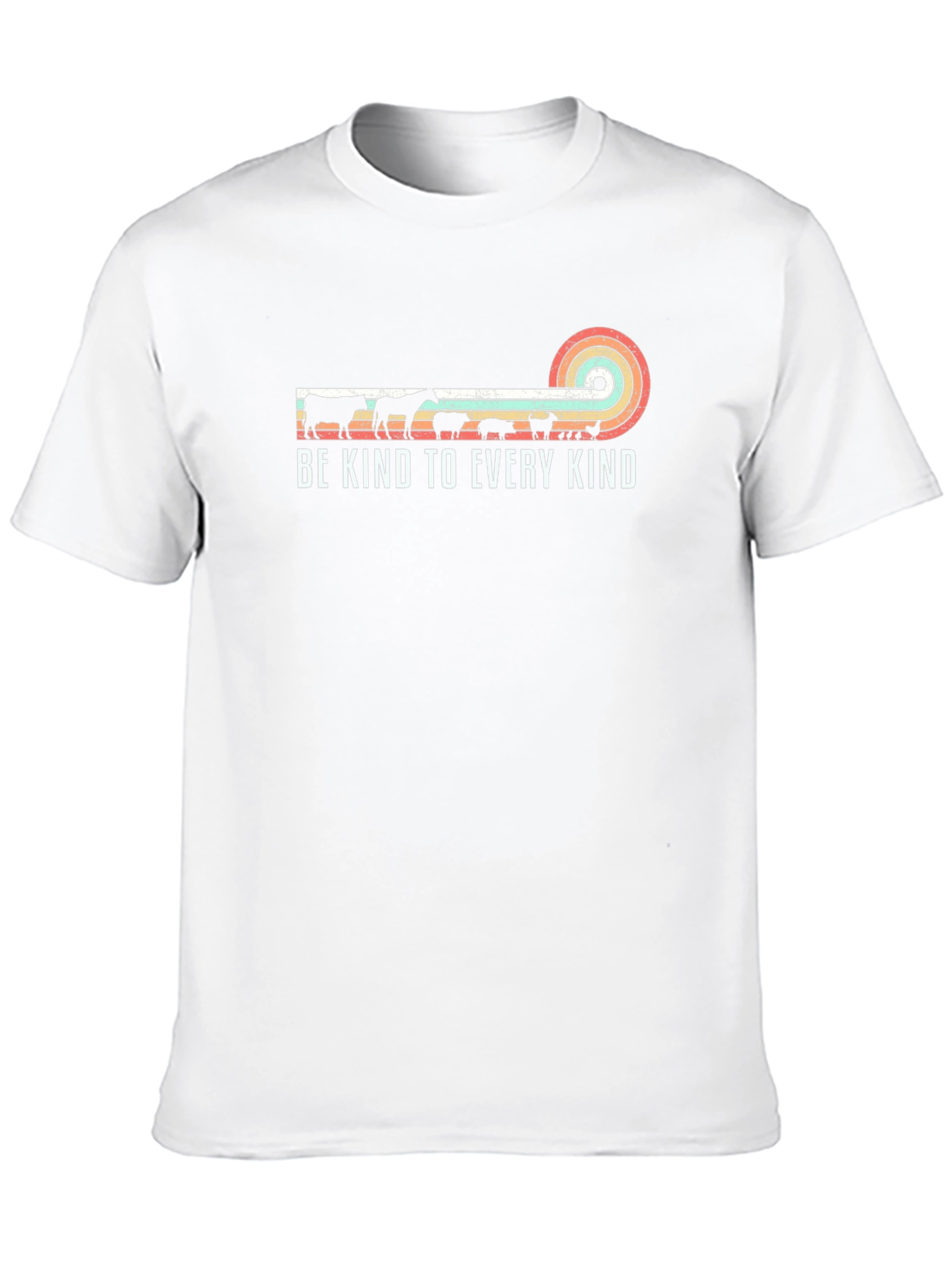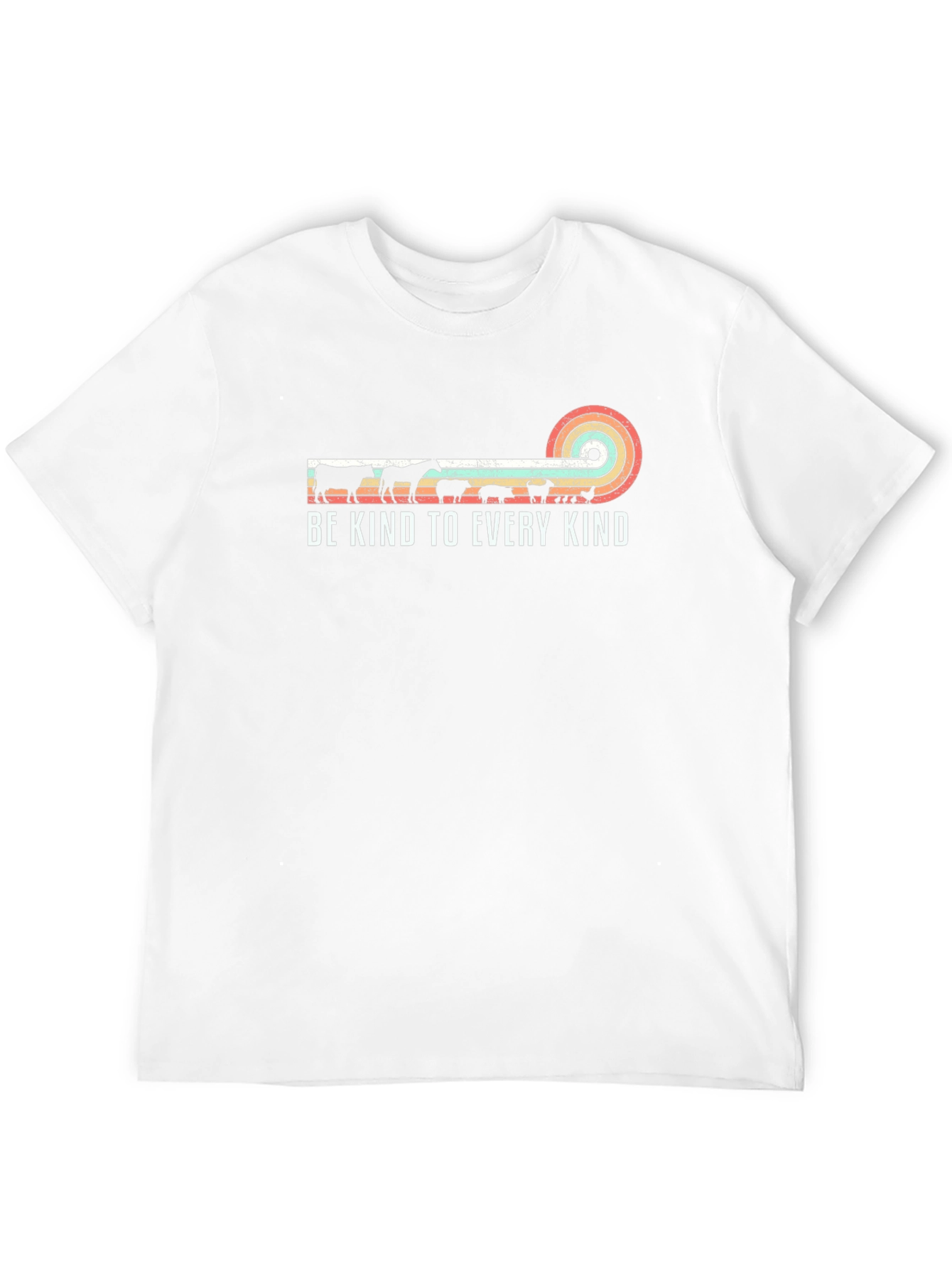 This stylish black t-shirt features a unique graphic design promoting animal rights and kindness. The print showcases silhouettes of various farm animals aligned horizontally beside a retro-style sun graphic. Below, the powerful message "BE KIND TO EVERY KIND" is displayed in bold, white lettering. The shirt appears to be made from soft, comfortable fabric, ideal for everyday wear. Show your support for animal welfare while making a fashion statement with this eye-catching t-shirt. Perfect for casual outings, social events, or simply lounging at home, this shirt makes a great conversation starter and promotes a positive message.