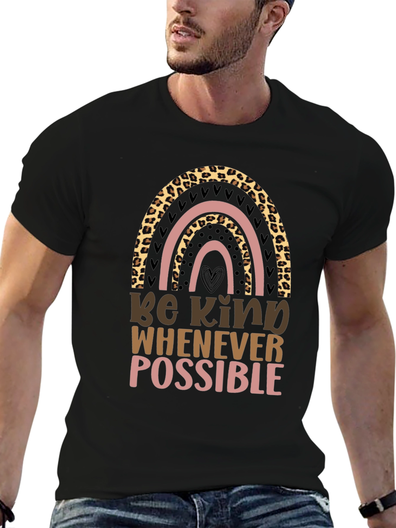 Spread positivity with this stylish black t-shirt featuring a unique rainbow design. The rainbow incorporates a leopard print, black hearts, and solid pink. Below, the tee reads "Be Kind Whenever Possible" in complementary brown and pink fonts. This tee is perfect for casual wear, lounging, or making a statement about kindness and compassion. Comfortable and eye-catching, this shirt is sure to become a favorite in your wardrobe. A wonderful way to spread a positive message!