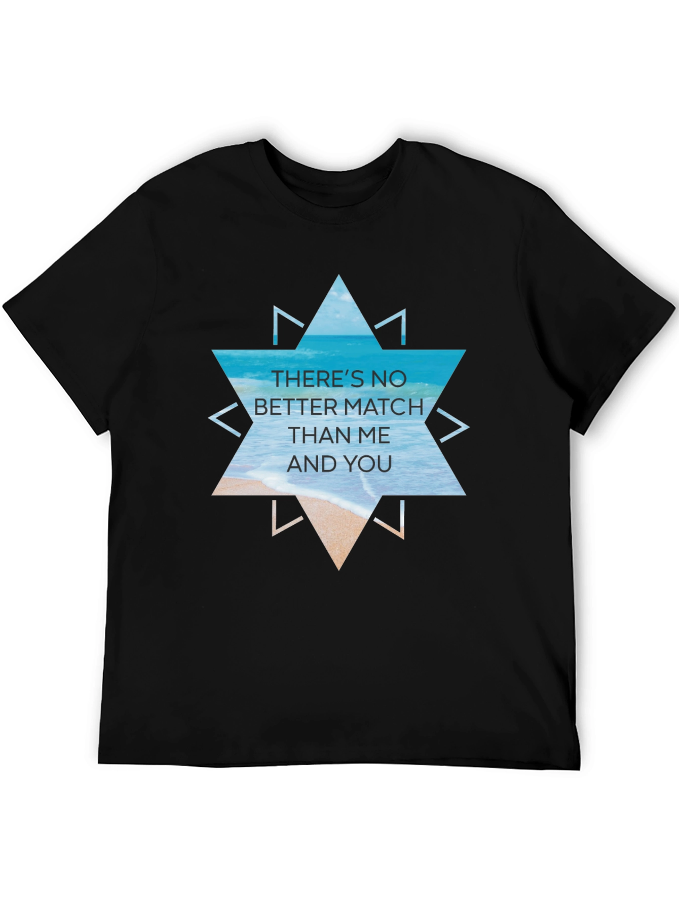 This eye-catching black t-shirt features a unique geometric design filled with a serene beach scene. The graphic includes calming turquoise ocean waves meeting a sandy shore, creating a tranquil visual. Boldly displayed within the shape is the phrase "There's No Better Match Than Me and You", making it a perfect gift for a significant other or a stylish statement piece for everyday wear. Made from comfortable materials, this tee is ideal for casual outings, beach days, or simply expressing your love for the ocean. Stand out with this blend of modern design and peaceful imagery.