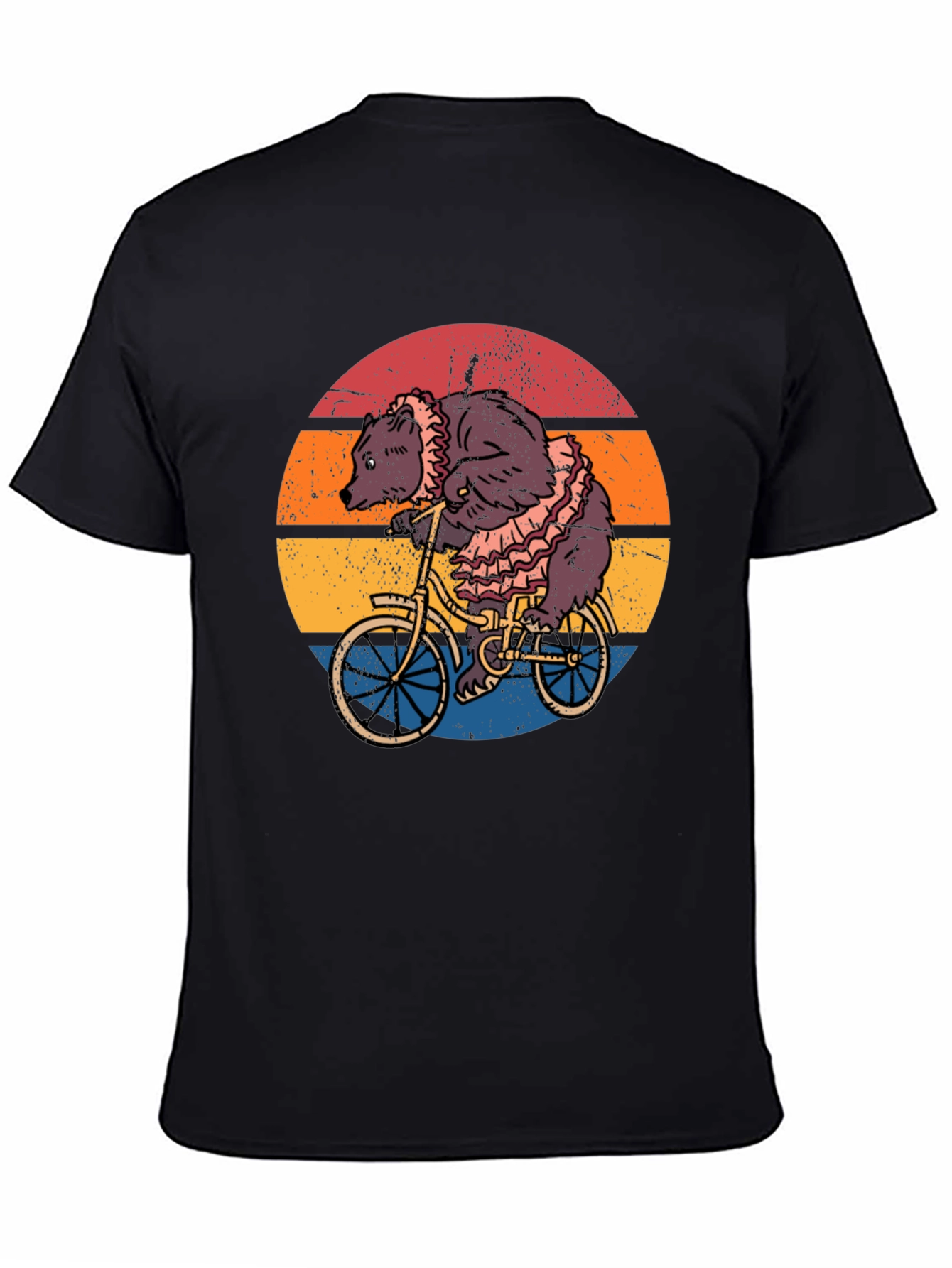 Embrace whimsy with this eye-catching black tee featuring a unique graphic design. A delightful bear cheerfully rides a bicycle against a retro-inspired sunset backdrop. The design incorporates red, yellow, and blue hues within the graphic, creating a visually appealing contrast on the classic black shirt. Made from comfortable, breathable fabric, this t-shirt is perfect for casual wear, outings with friends, or as a conversation starter. This standout tee is sure to inject a touch of fun into your wardrobe. Wear your individuality proudly and enjoy the comfy fit of this statement piece.