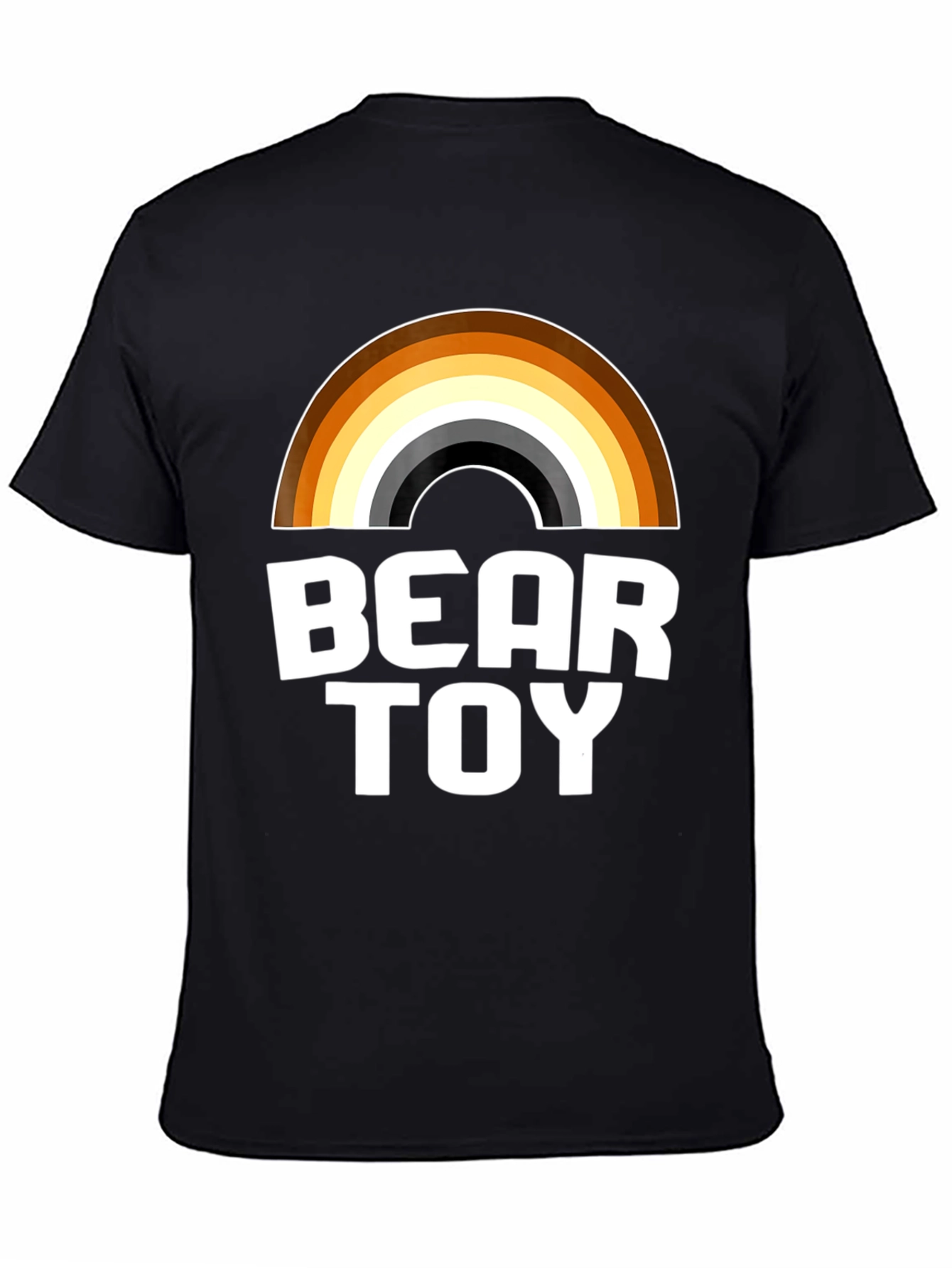 Show off your fun side with this "Bear Toy" graphic t-shirt! The design features a colorful rainbow arch in brown, tan, white, and gray. The bold white text "BEAR TOY" pops against the shirt, making a statement. Perfect for casual wear, events, or showing off your unique personality. Made from comfortable materials, this tee is sure to become a favorite in your wardrobe. Get yours today!