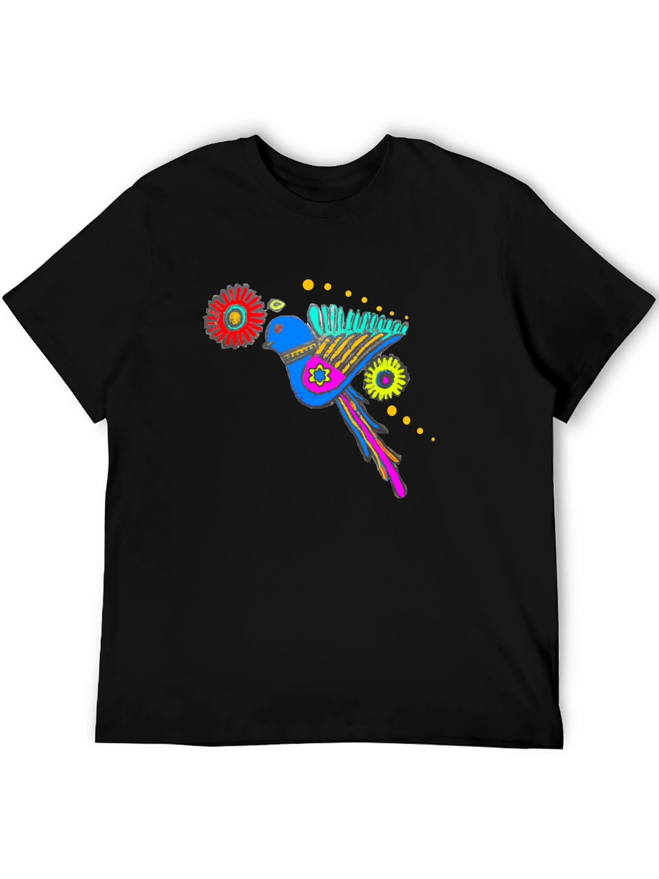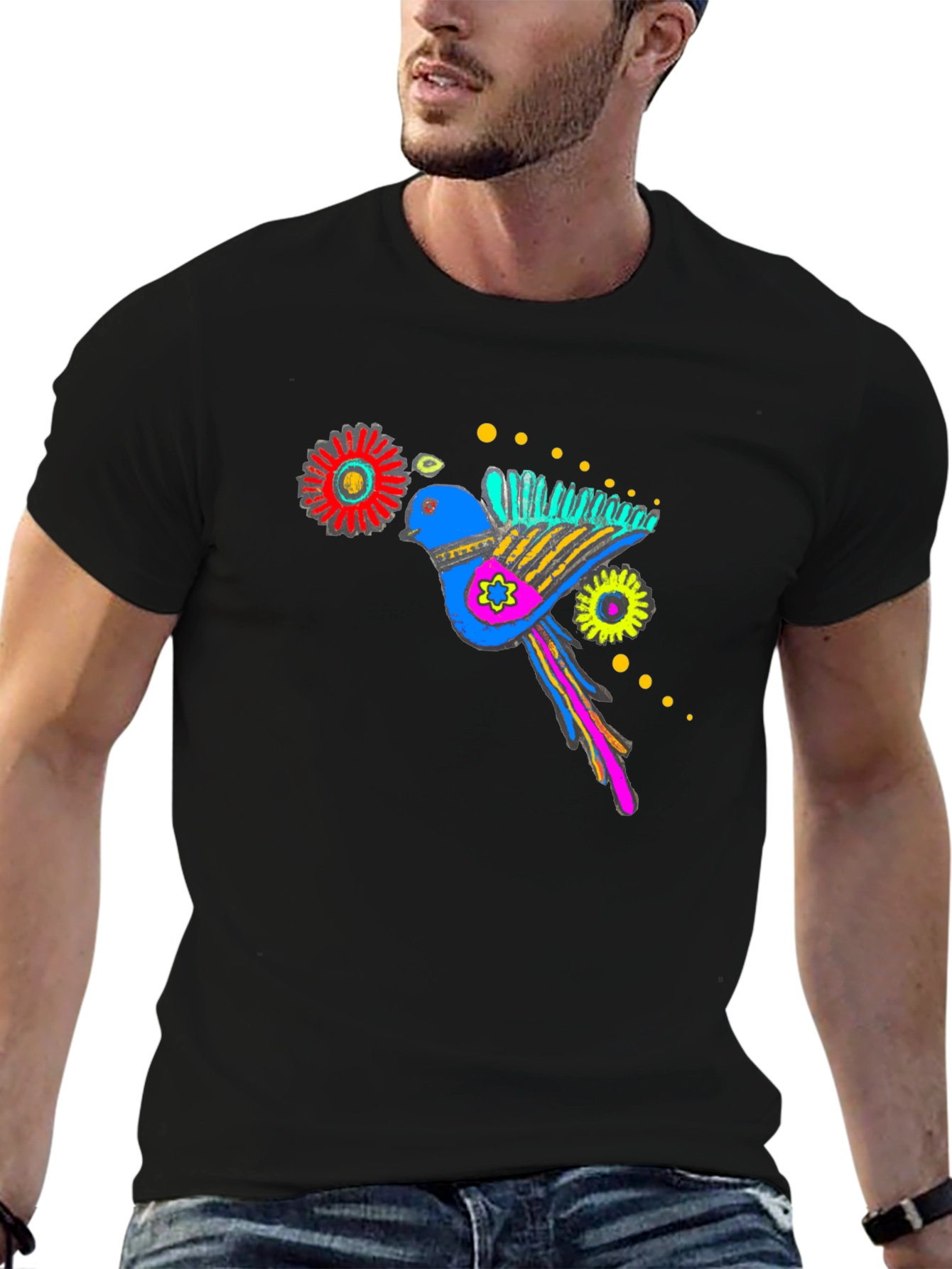 Elevate your style with this eye-catching black t-shirt featuring a vibrant bird graphic. The unique design incorporates colorful flowers and artistic detailing, making it a standout piece. Made from comfortable material, this tee is perfect for everyday wear. Pair it with jeans or shorts for a casual yet fashionable look. Ideal for those who appreciate bold designs and expressive style, this t-shirt is a must-have addition to your wardrobe. Make a statement and showcase your personality with this artistic and trendy piece!