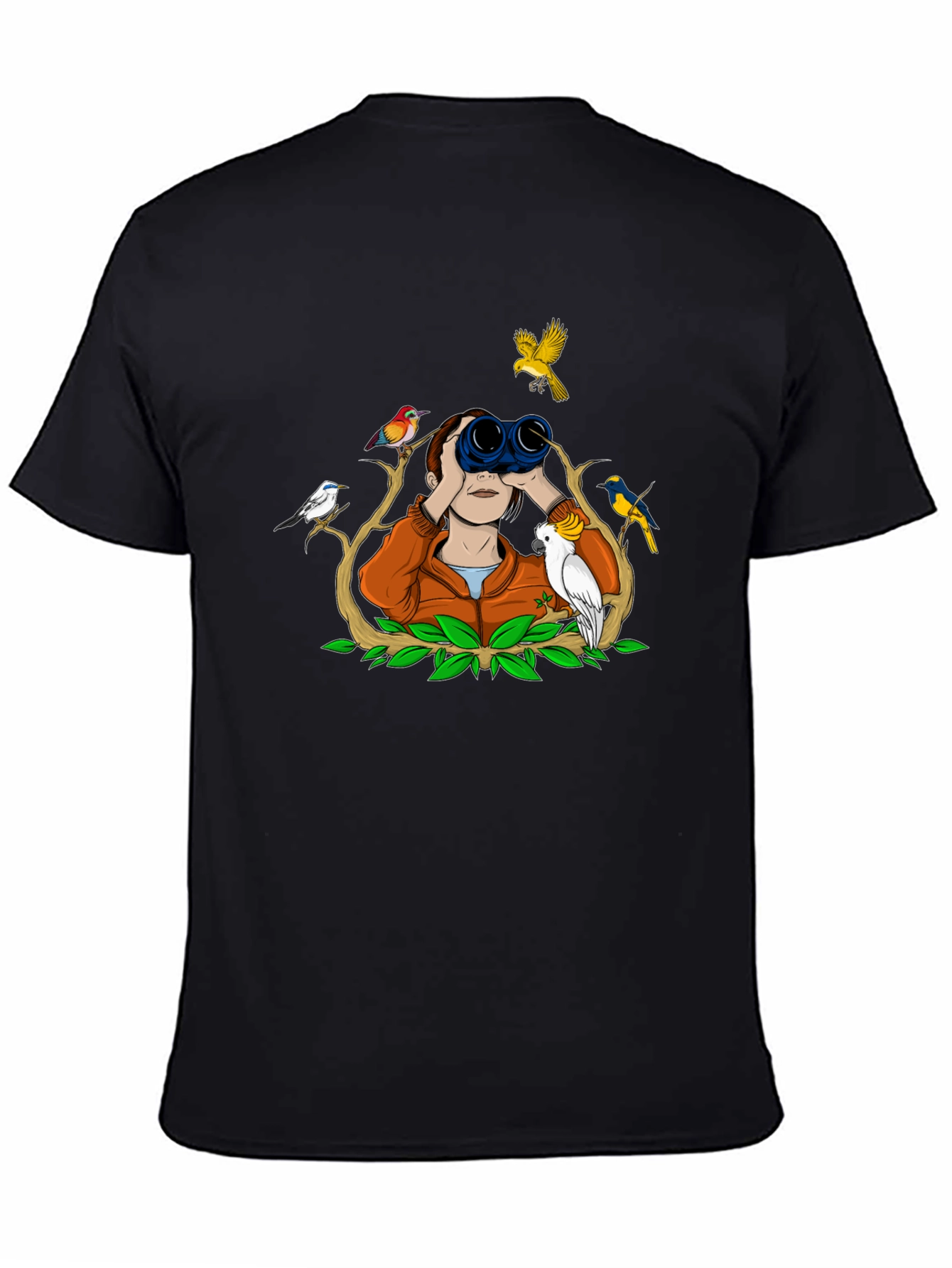 Show off your love for bird watching with this unique graphic tee! The black t-shirt features a colorful illustration of a person using binoculars, surrounded by various birds perched on branches. Green leaves accent the design, giving it a natural, outdoorsy feel. Made from a comfortable fabric, this tee is perfect for casual wear or your next birding adventure. Get yours today and let your passion take flight!