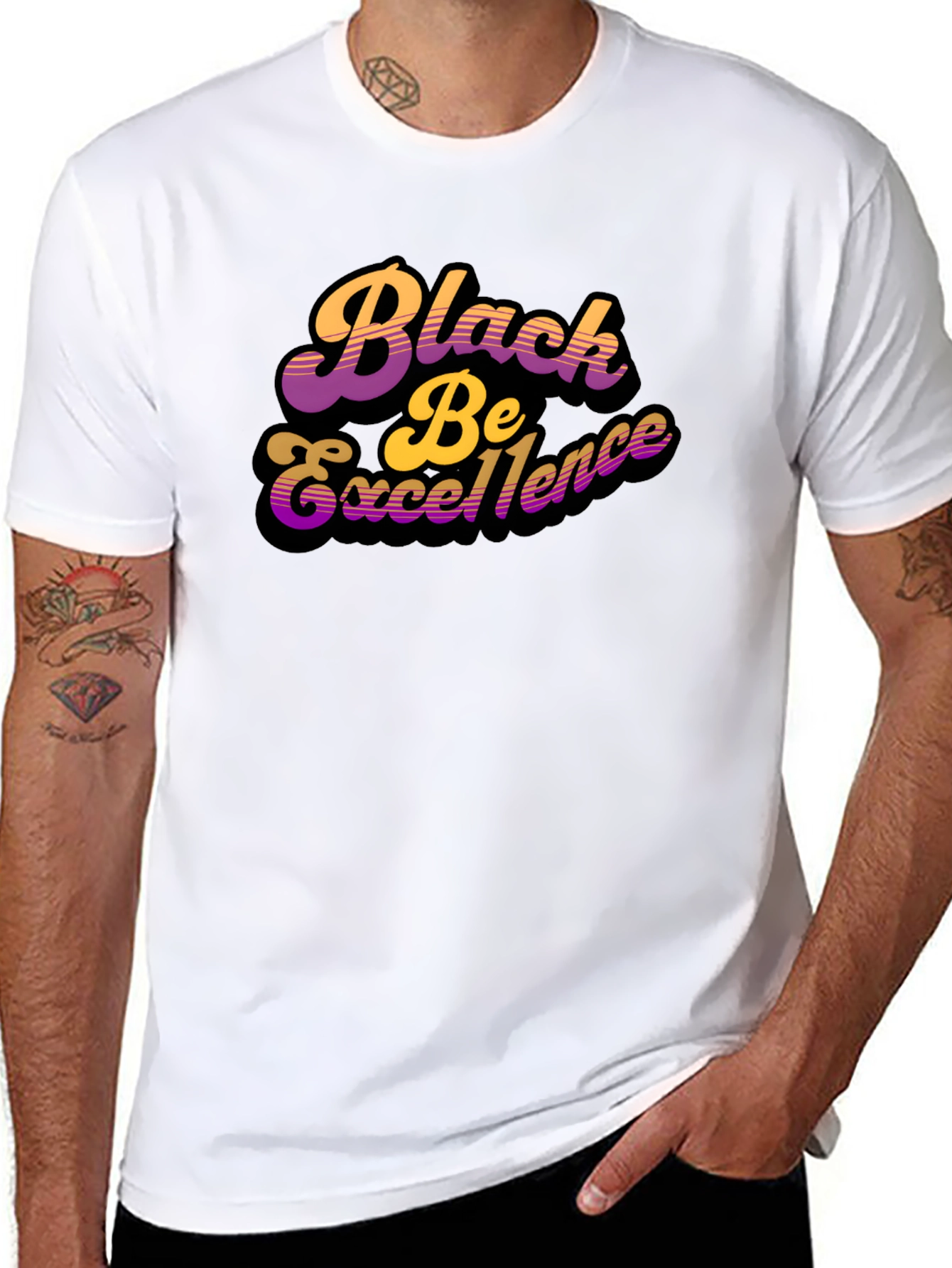 Show your pride and inspire others with this stylish "Black Be Excellence" graphic tee! The shirt features a bold, retro-inspired design, with layered fonts and a vibrant gradient color scheme of yellow, orange and purple. Made from a soft, comfortable fabric, this tee is perfect for everyday wear or special occasions. The classic crew neck and short sleeves offer a relaxed fit. Pair it with jeans for a casual look, or dress it up with a blazer for a more polished style. Make a statement and spread positivity with this unique and eye-catching t-shirt!