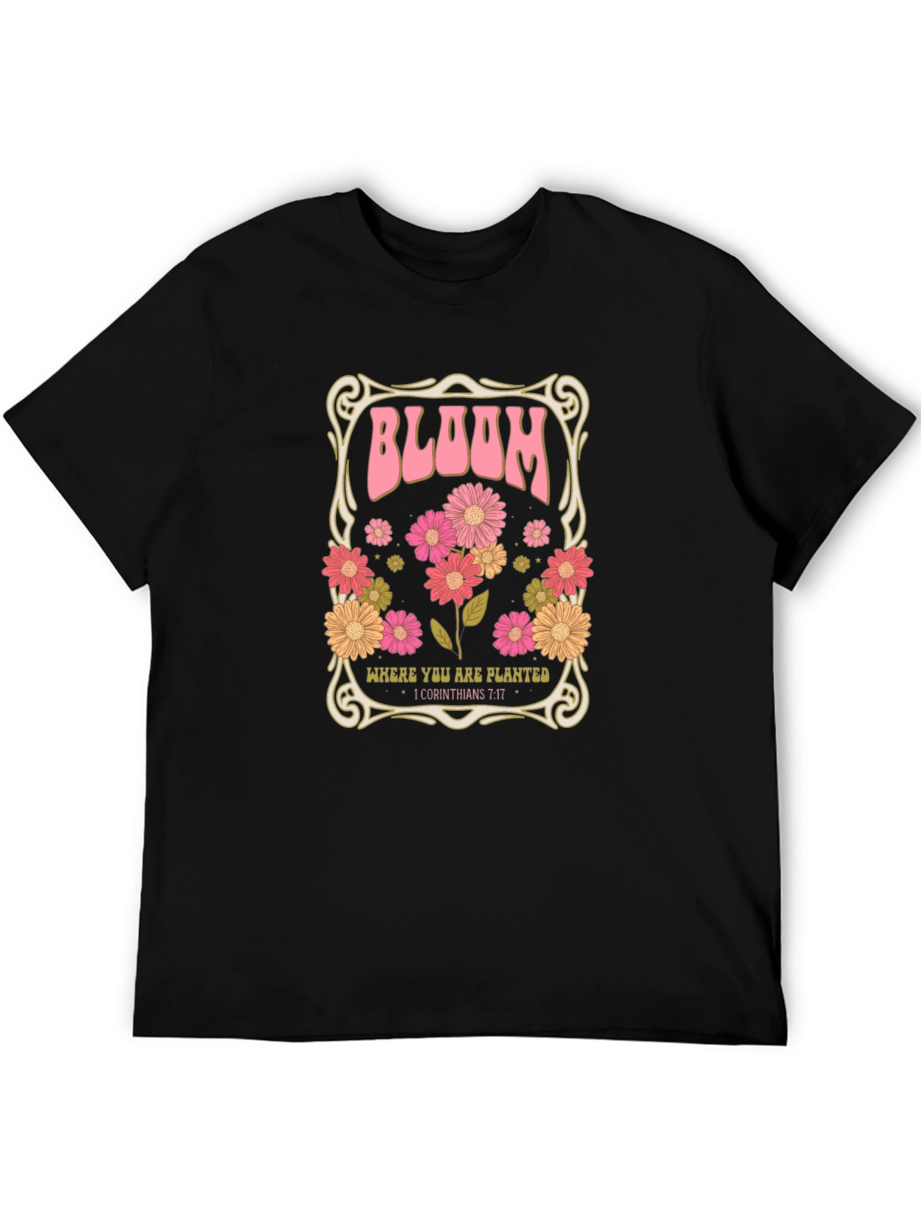 Show your faith and style with this unique Bloom Where You Are Planted t-shirt. The black tee features a vibrant graphic with the word "Bloom" in a retro pink font. The design includes colorful flowers and an ornate frame, alongside the inspirational message "Where You Are Planted - 1 Corinthians 7:17". Perfect for everyday wear, church events, or as a thoughtful gift. Made from comfortable, breathable fabric for all-day comfort and lasting wear. Spread positivity and inspire others with this eye-catching and meaningful shirt.