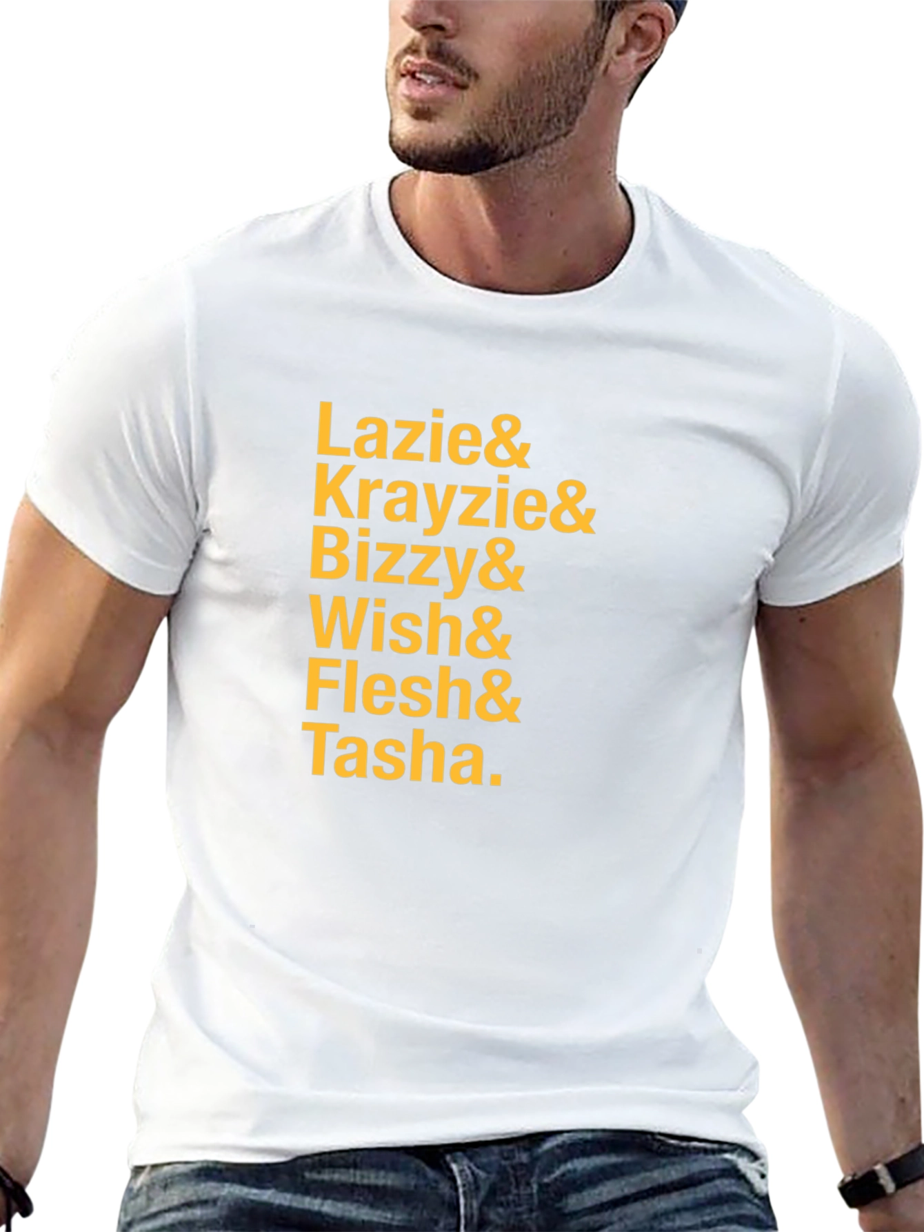 Show your love for Bone Thugs-n-Harmony with this stylish black t-shirt. Featuring the names "Lazie & Krayzie & Bizzy & Wish & Flesh & Tasha" printed in a vibrant yellow, this shirt is a must-have for any fan. Made from a soft and breathable fabric, this t-shirt offers both comfort and durability. The classic crew neck design makes it perfect for casual wear, concerts, or simply lounging around. Available in various sizes, this shirt is a great way to showcase your musical taste. Grab yours today and represent your favorite rap group in style!