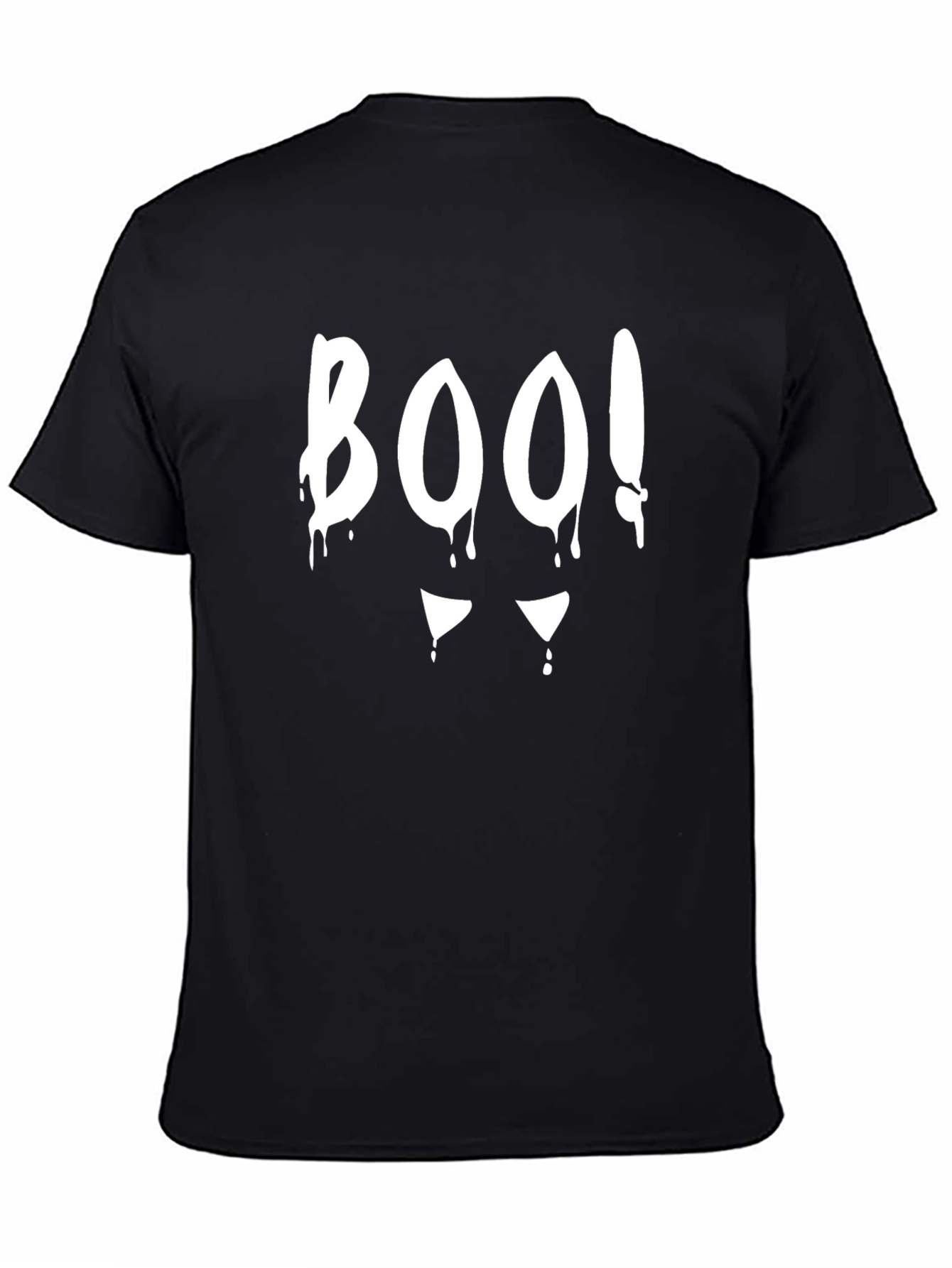 Get spooky with this eye-catching black t-shirt featuring a bold "BOO!" graphic in dripping white paint style. Below the text are two triangles. Made from soft, breathable cotton, this tee offers a comfortable fit for all-day wear. The playful design makes it perfect for Halloween parties, casual outings, or adding a touch of festive fun to your everyday wardrobe. Show off your Halloween spirit in style with this unique and comfortable t-shirt. Makes a great Halloween gift or party favor! Available in various sizes.