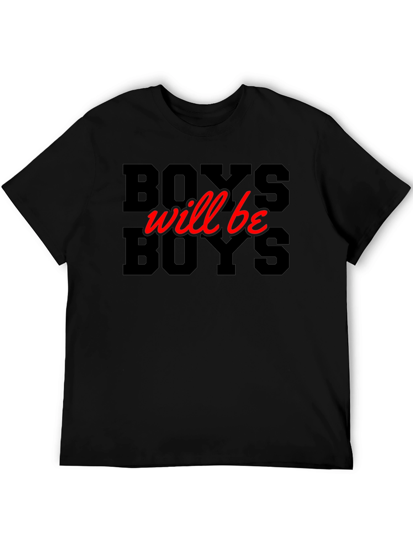 Make a statement with this bold black graphic tee! Featuring the iconic phrase "Boys will be boys" emblazoned across the chest, this shirt offers a unique blend of classic and contemporary style. The text is displayed with the words "BOYS" shown in black with the words "will be" in bright red. This shirt is perfect for casual outings, making a statement, or just lounging in comfort. The classic crew neck and short sleeves offer a relaxed fit, making it easy to pair with jeans, shorts, or your favorite casual bottoms. It's a standout piece for anyone looking to add a touch of playful personality to their wardrobe.