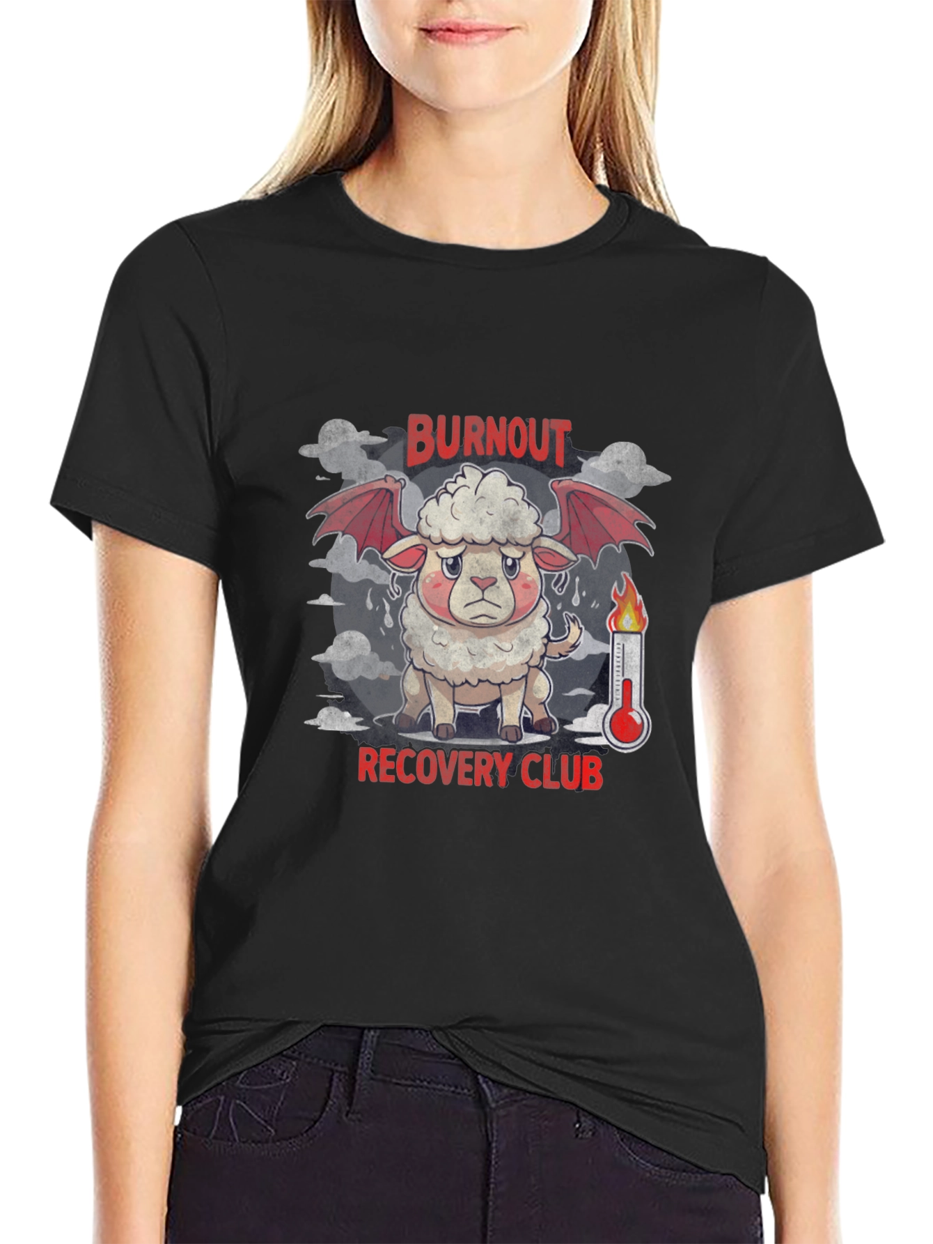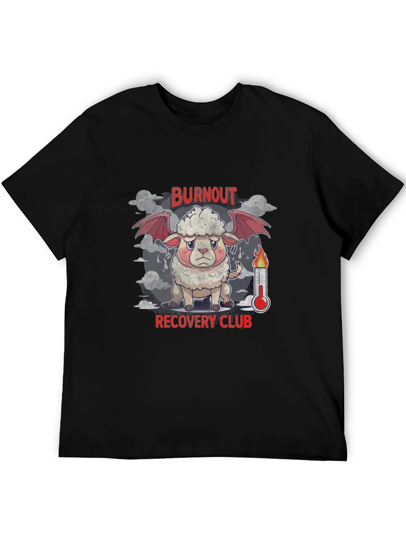 Show your support for mental health and self-care with this unique "Burnout Recovery Club" graphic tee. Featuring a distressed cartoon sheep with devil wings next to a fiery thermometer, this tee makes a statement. The design is printed on a soft, comfortable black cotton fabric. Perfect for casual wear, the gym, or simply lounging around, this tee is sure to spark conversation. Grab yours today and join the club!