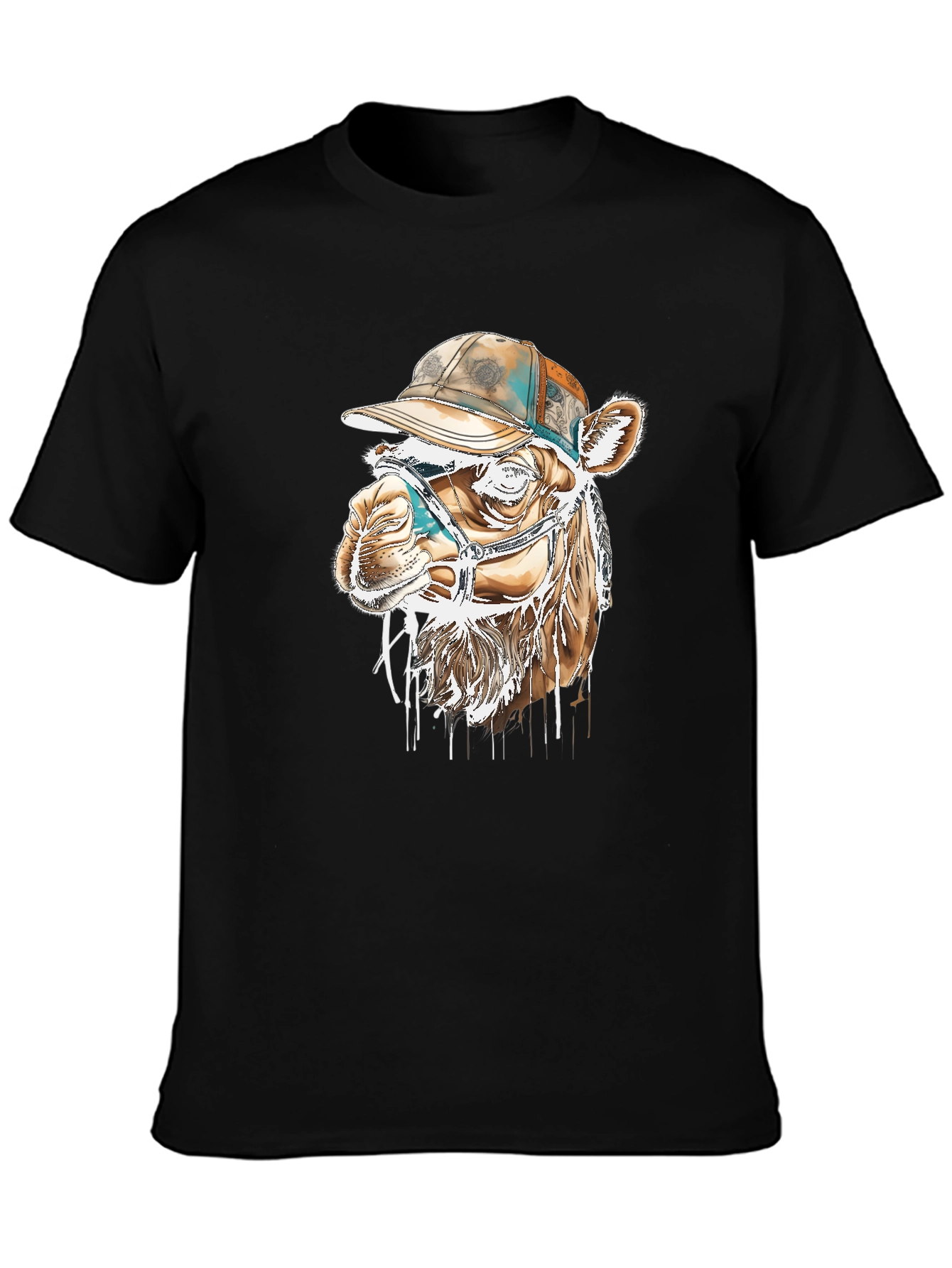 Show off your unique style with this eye-catching t-shirt. This black tee features a distinctive graphic print of a camel wearing a hat and face covering. The design is bold, modern and sure to turn heads. Made from a comfortable-looking fabric, this shirt is perfect for everyday wear. Whether you're hanging out with friends or hitting the town, this tee adds a touch of personality to any outfit. The durable construction ensures long-lasting wear, making it a staple in your wardrobe. Express yourself with this must-have piece!