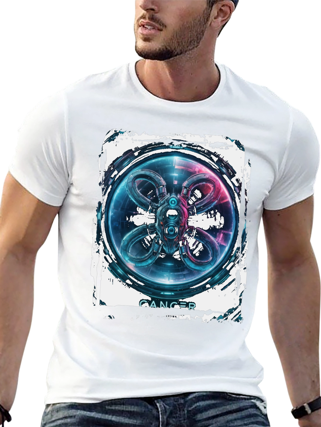 Elevate your style with this unique black t-shirt featuring an eye-catching abstract graphic. The design showcases a futuristic, circular emblem with intricate details, glowing neon accents of blue and pink, and a distressed border for an edgy aesthetic. The word "CANCER" is emblazoned beneath the central graphic. Perfect for those who love bold, statement pieces, this tee is ideal for casual outings, concerts, or expressing your individual style. Crafted for comfort and designed to turn heads, this shirt is a must-have addition to any wardrobe. Stand out from the crowd and make a statement with this distinct graphic tee.