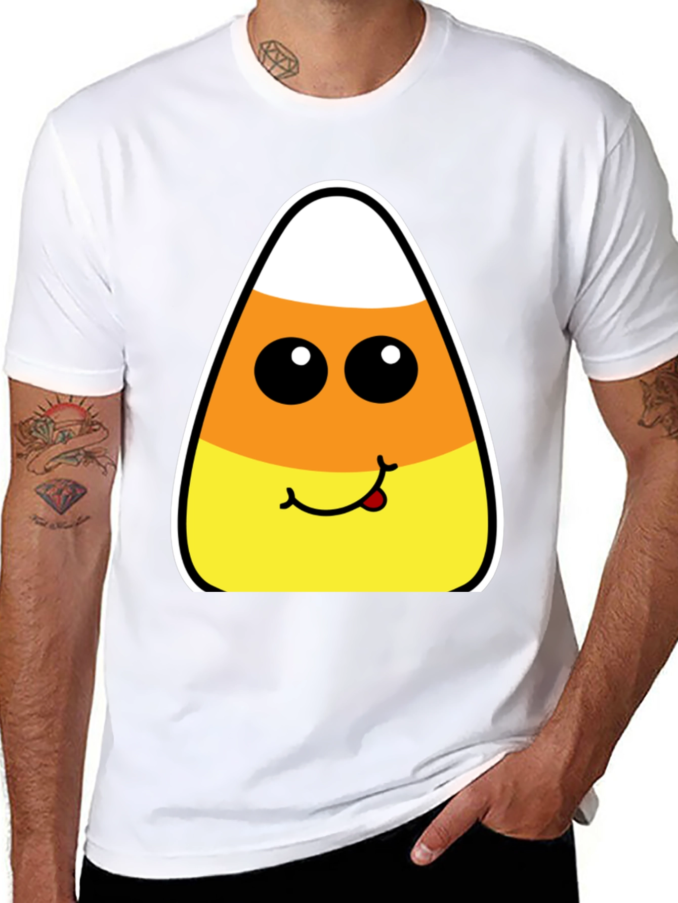 Get ready for Halloween with this playful black t-shirt! Featuring a cute candy corn face design, this tee is perfect for adding a touch of spooky fun to your wardrobe. The bright colors and cartoonish style will surely make you stand out at any Halloween gathering. Made from comfortable materials, it's great for casual wear, parties, or trick-or-treating. Show off your sweet side this Halloween with this adorable shirt!