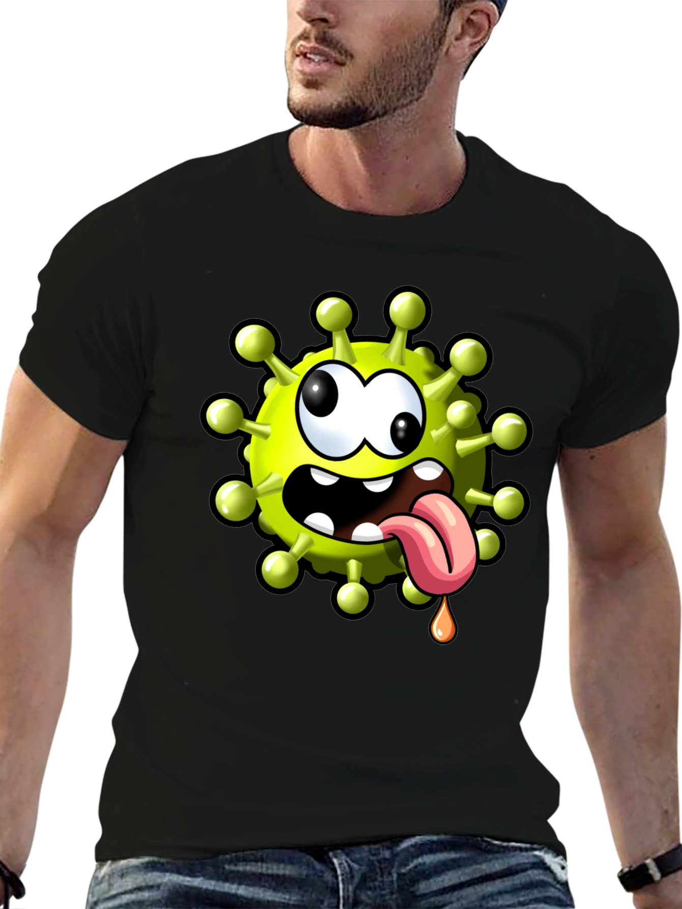 Show off your quirky side with this eye-catching black t-shirt featuring a cartoon virus graphic. The fun and vibrant design showcases a green virus character with a playful expression and protruding tongue, making it a standout piece. Made from comfortable, breathable fabric, this tee is perfect for casual wear, parties, or making a statement. Its unique design is sure to spark conversations and bring a smile to anyone's face. Add a touch of humor to your wardrobe with this must-have novelty tee and let your personality shine. Great gift for science lovers or anyone with a fun sense of style.