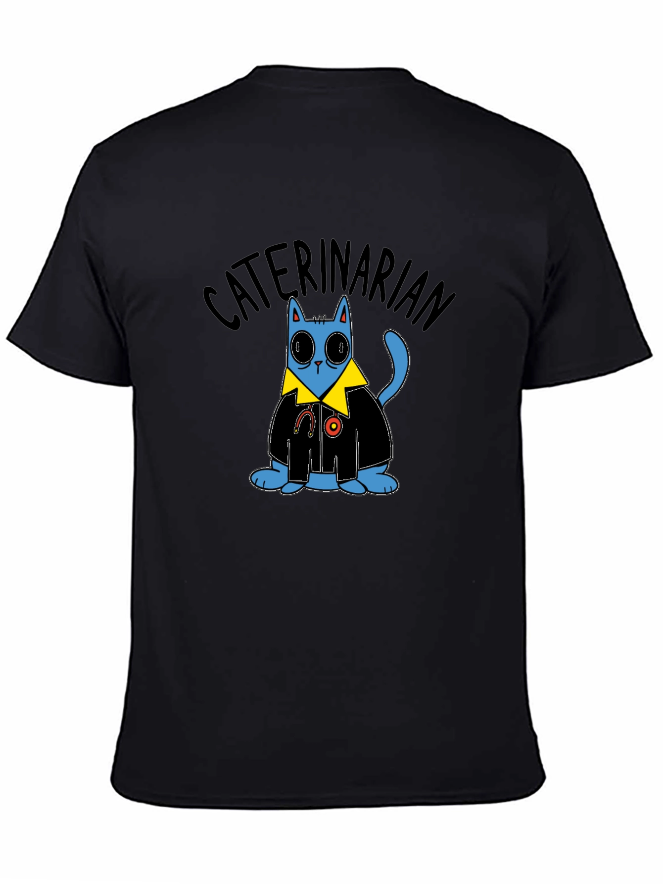 This t-shirt features a fun and quirky design of a blue cat dressed as a veterinarian, complete with a stethoscope around its neck. Above the cat graphic is the text "CATERINARIAN". This novelty t-shirt is perfect for cat lovers, vets, or anyone with a playful sense of humor. Made from a comfortable, breathable fabric, this tee is ideal for casual wear or veterinary professionals looking to add some fun to their wardrobe. Show off your love for felines and your passion for animal care with this unique and eye-catching graphic tee!