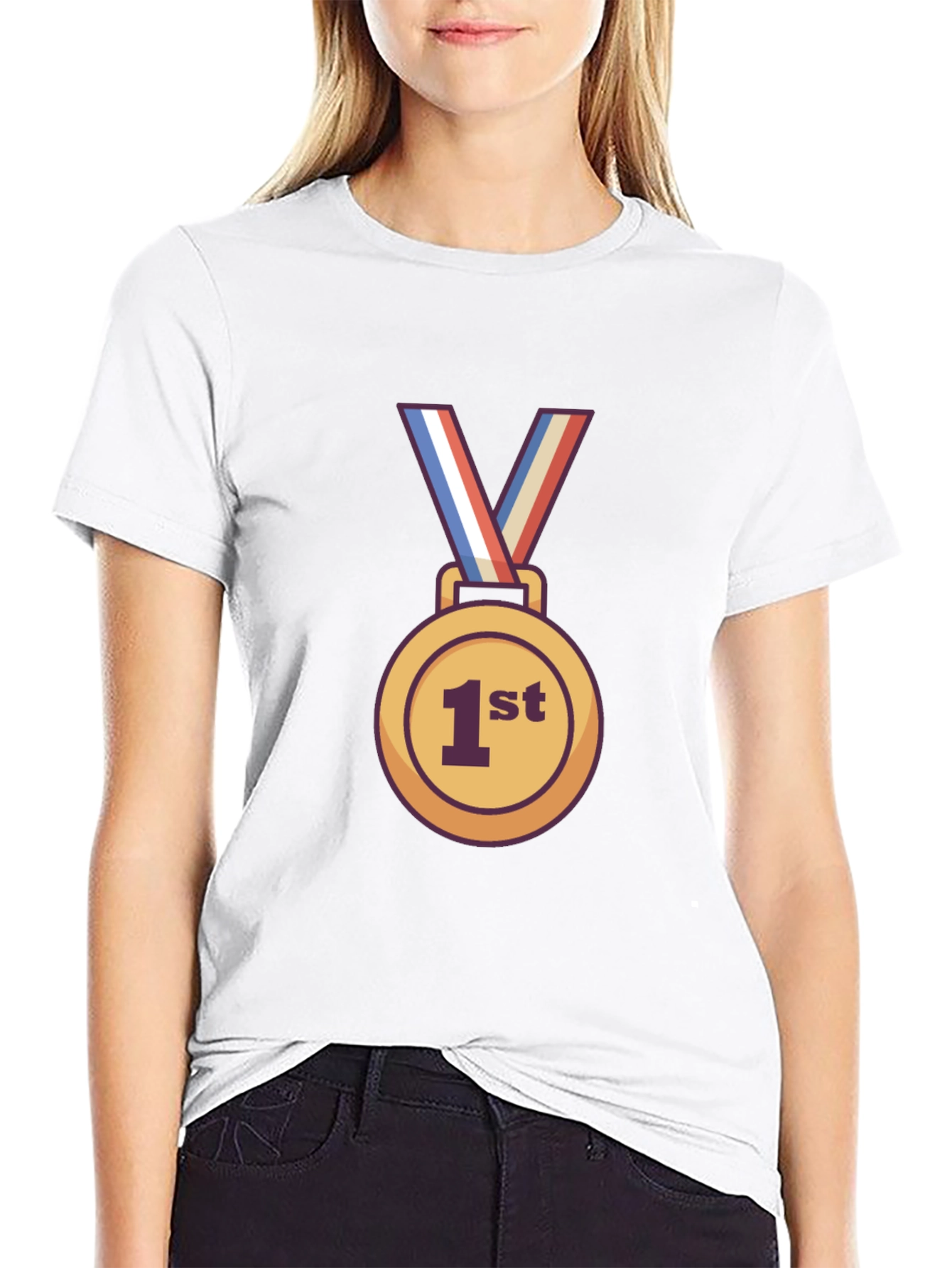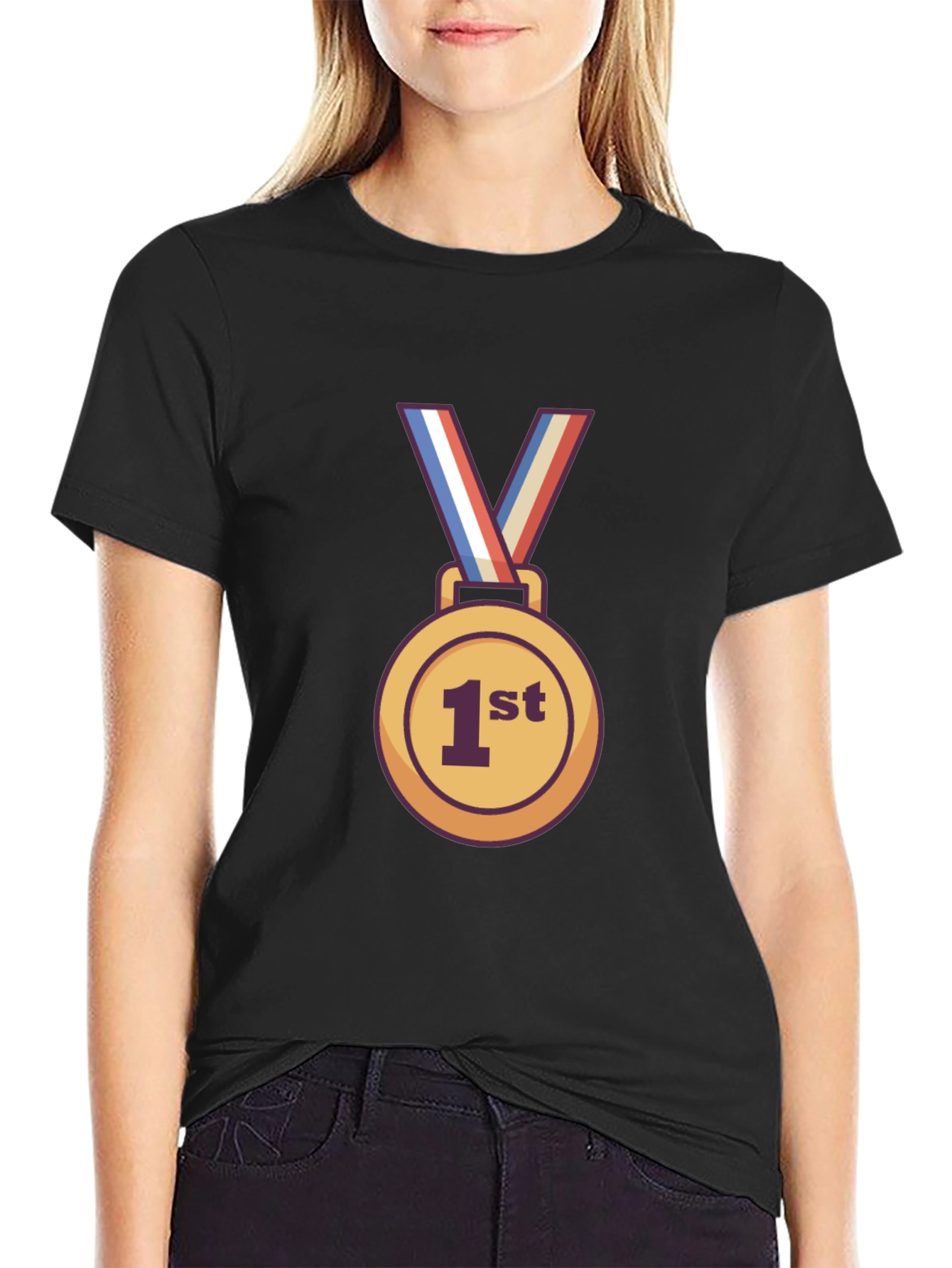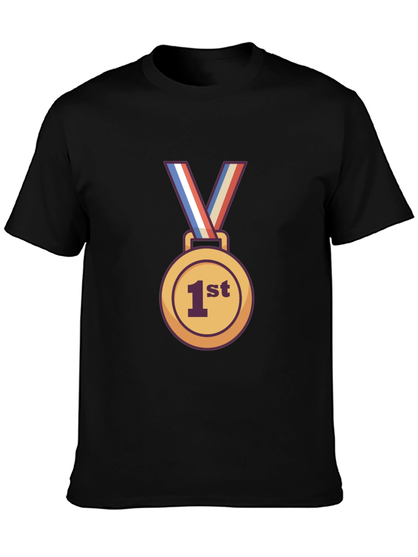 Show off your winning spirit with this eye-catching black t-shirt! The tee features a vibrant, cartoon-style graphic of a gold medal with the text "1st" inside. The medal hangs from a striped red, white, and blue ribbon, giving it a patriotic and playful touch. Crafted from a comfortable-looking fabric, this t-shirt is perfect for casual wear, sports events, or just expressing your competitive nature. Make a statement and let everyone know you always strive for first place! A great conversation starter and a fun addition to any wardrobe.