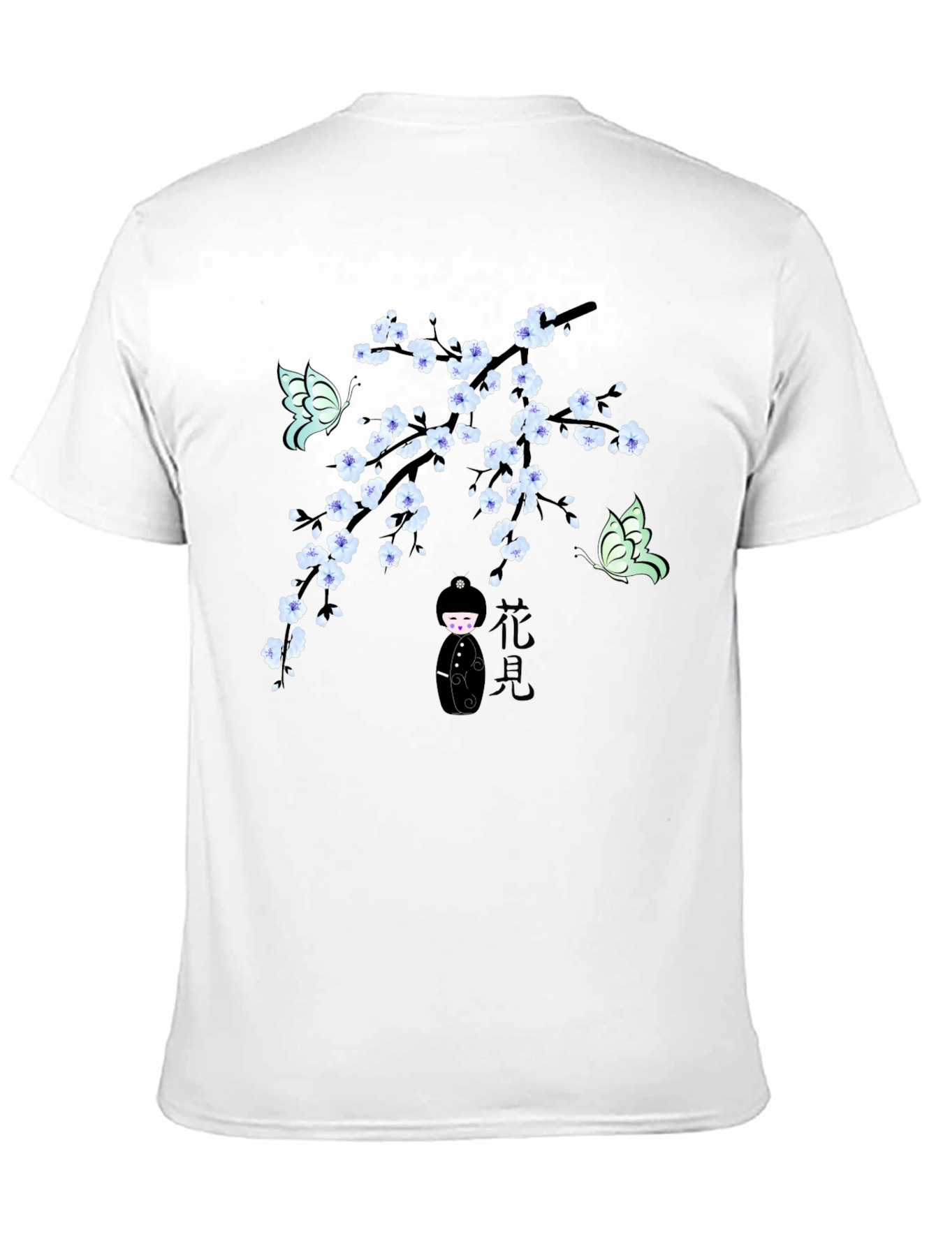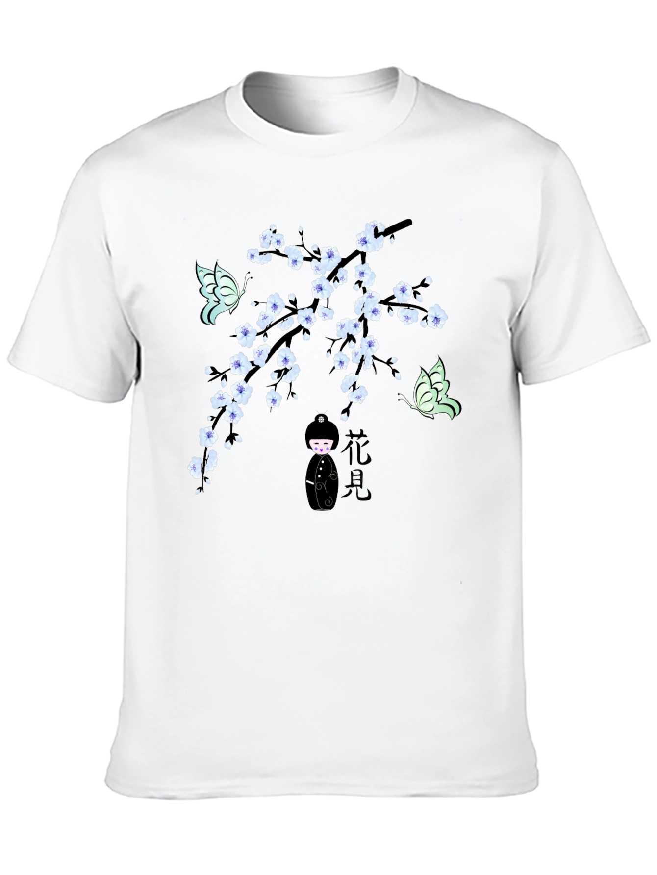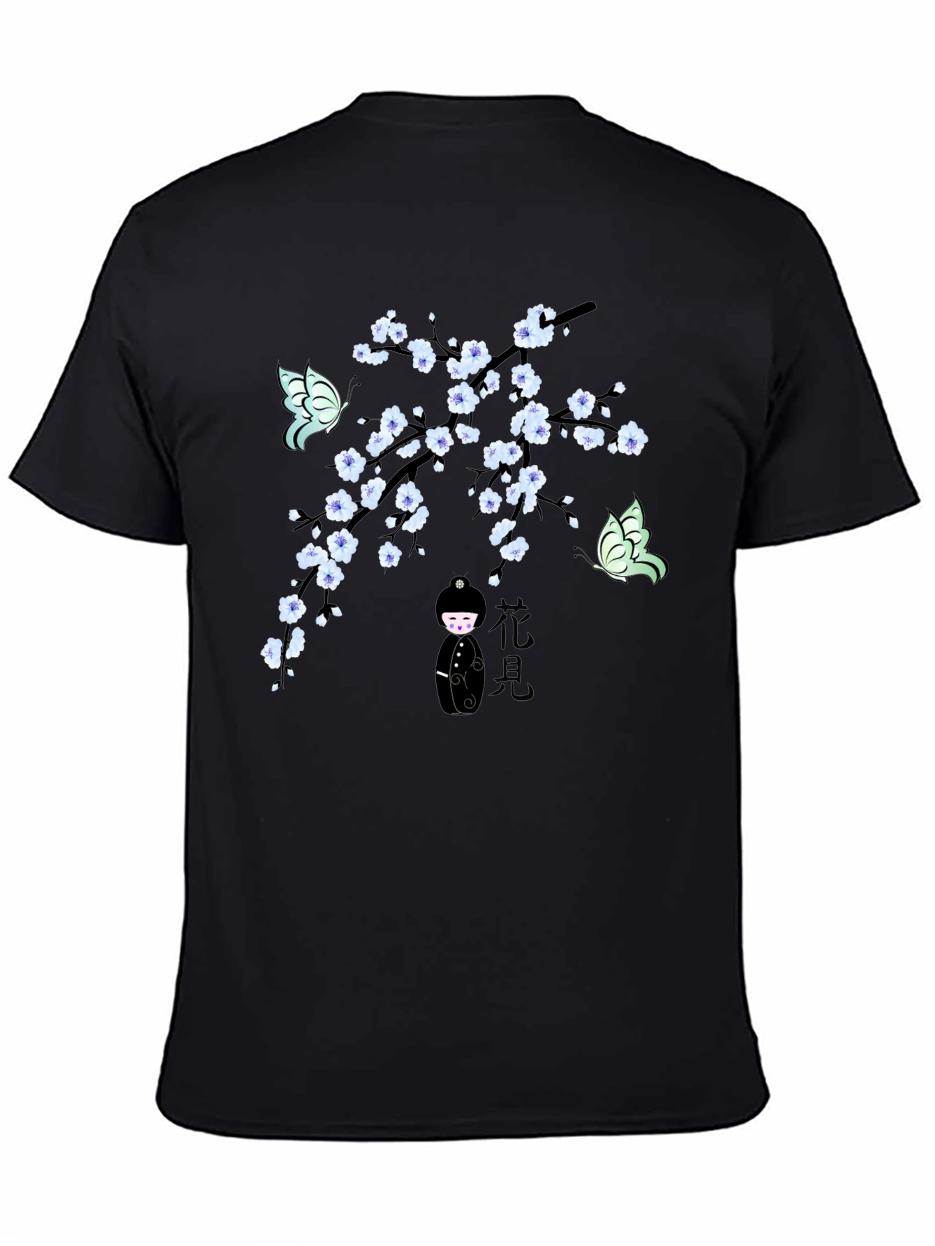 Embrace the beauty of nature with this stylish black T-shirt. The design showcases a delicate cherry blossom branch adorned with pastel-colored butterflies. A unique geisha doll and Japanese calligraphy add an extra touch of mystique. Made from a comfortable, breathable fabric, this T-shirt is perfect for casual wear and makes a great conversation starter. Show off your unique style with this trendy and eye-catching T-shirt that effortlessly blends fashion and art. Perfect for everyday wear or a special occasion.