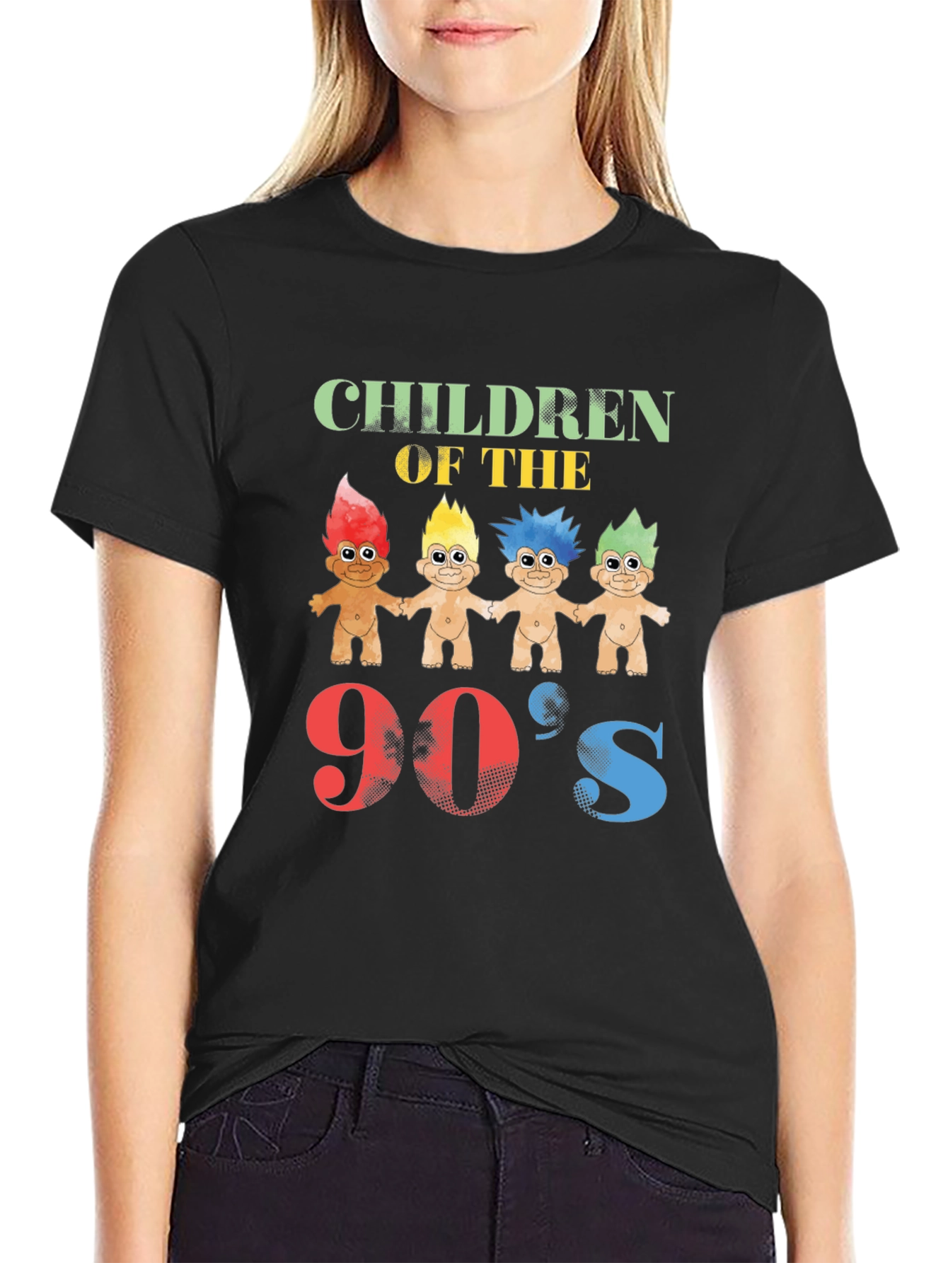 Show off your love for the 90's with this nostalgic black t-shirt! The shirt features the phrase "Children of the 90's" with a vintage, pixelated effect. The design includes a row of classic troll dolls with brightly colored hair, adding a playful and retro touch. Made from comfortable and durable material, this shirt is perfect for casual wear, retro-themed parties, or as a fun gift for anyone who grew up in the 90s. Wear your 90's pride with this awesome tee!