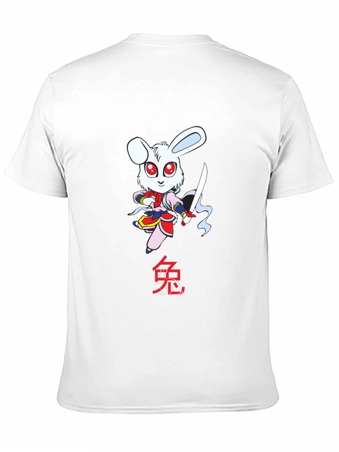 Show off your zodiac pride with this unique black t-shirt! Featuring a bold graphic of a cartoon rabbit wielding a sword with the Chinese symbol for rabbit underneath. The vibrant red and pink colors of the rabbit's attire pop against the shirt. Made from soft, breathable fabric, this tee is perfect for casual wear or as a conversation starter. Get yours today and represent your zodiac sign in style!