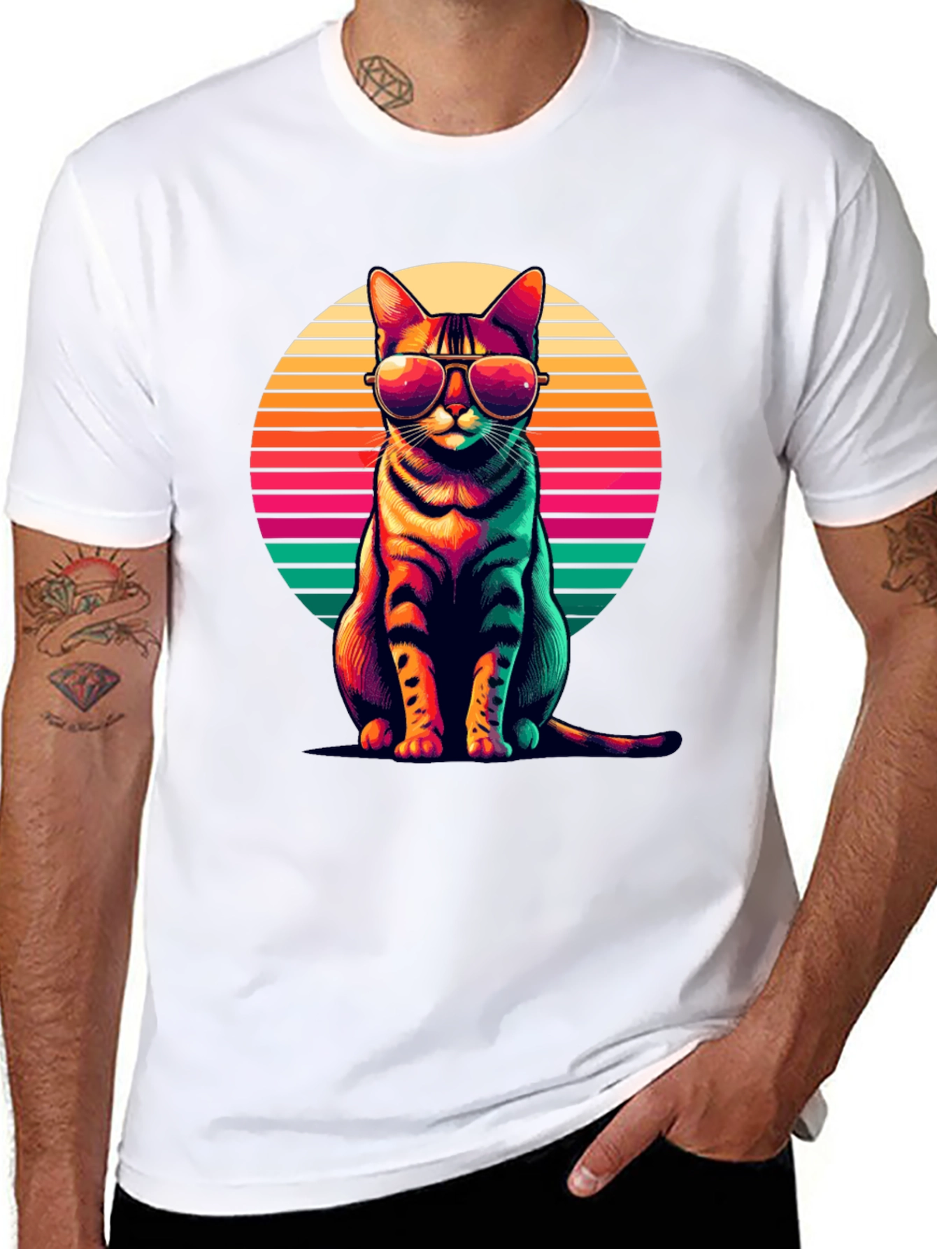 Rock a retro vibe with this unique black t-shirt. It features a vividly colored illustration of a cat wearing sunglasses, set against a striped sunset background. The graphic pops with bright hues of orange, pink, green, and yellow, offering a fun and eye-catching design. Made from a comfortable, breathable fabric, it's perfect for casual wear, summer outings, or anyone who loves quirky, stylish apparel. This tee is a standout piece that combines vintage aesthetics with modern flair - a must-have for cat lovers and fashion enthusiasts alike!