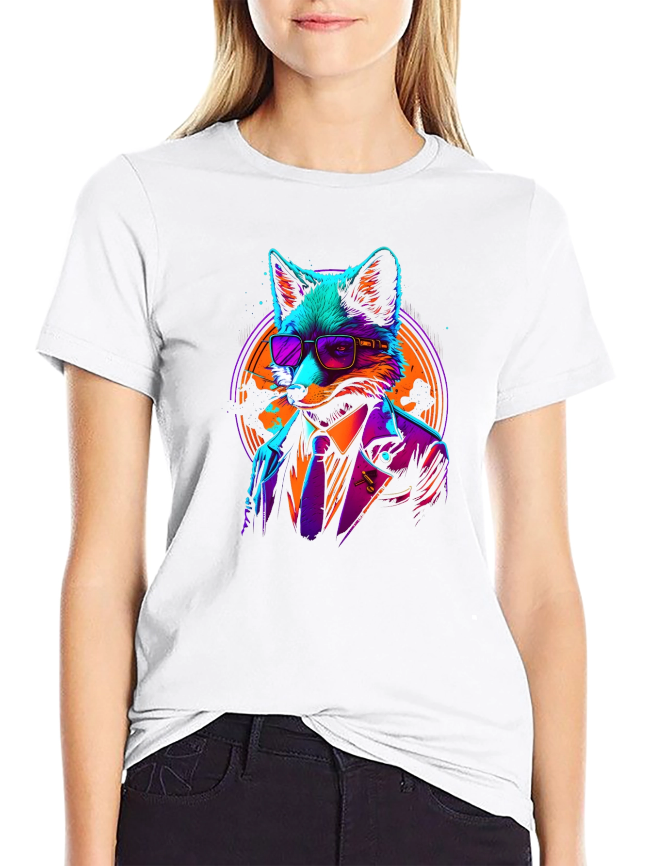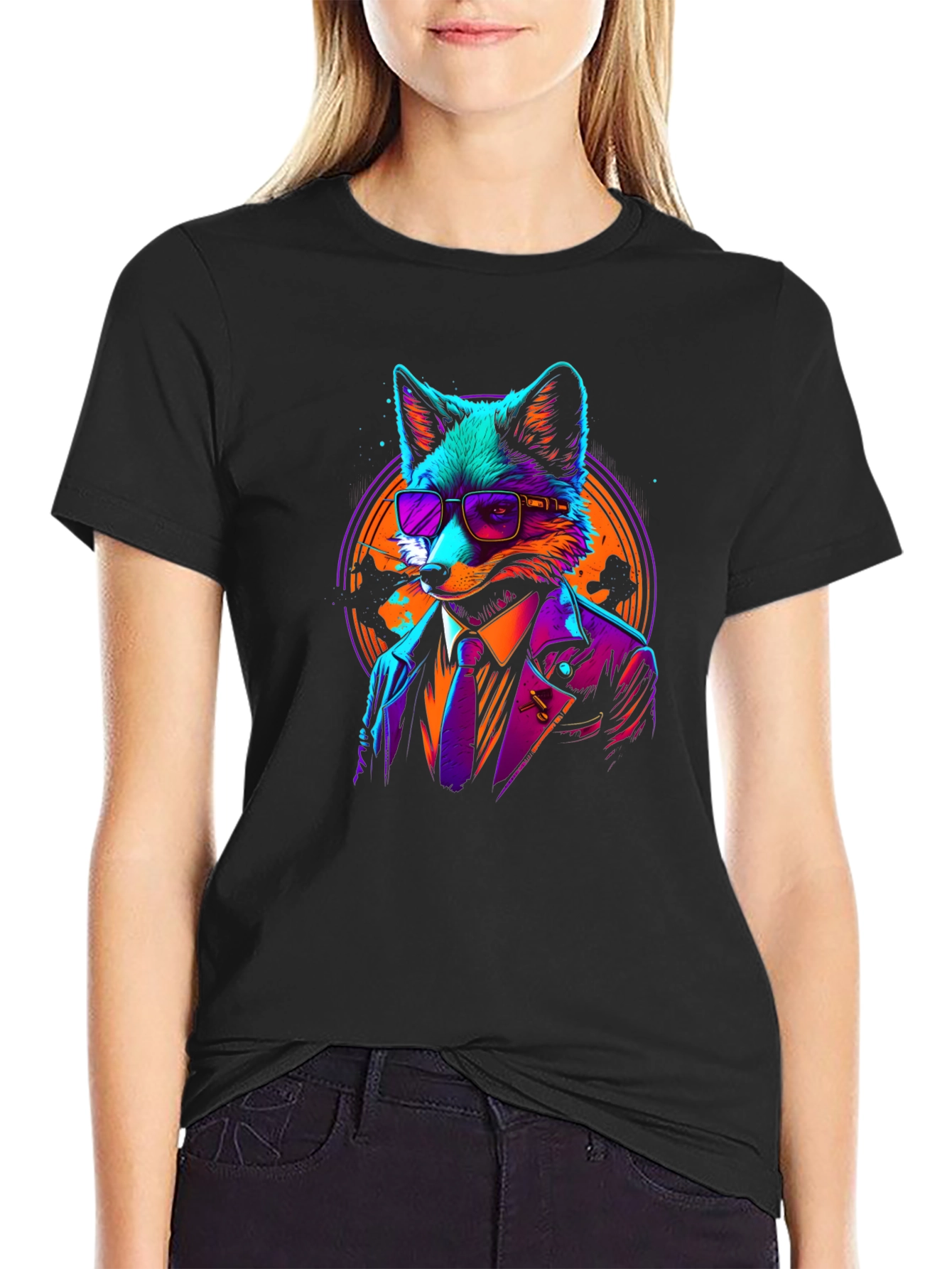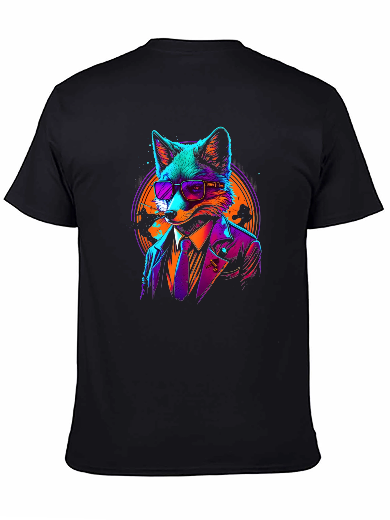 Elevate your style with this unique black t-shirt featuring a vibrant, digitally-rendered fox wearing sunglasses and a suit. The eye-catching design pops against the classic black background, making it a standout piece for any wardrobe. Made from comfortable, breathable fabric, this tee is perfect for casual outings, social gatherings, or just lounging at home. The detailed artwork showcases a playful yet sophisticated aesthetic, appealing to those who appreciate distinctive and expressive fashion. Add a touch of whimsy and personality to your look with this one-of-a-kind graphic tee.