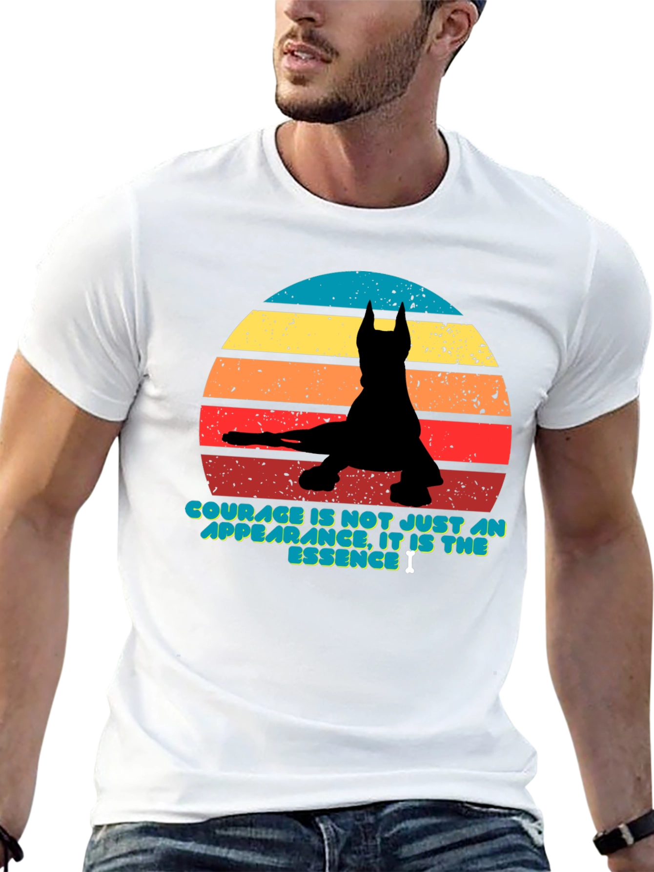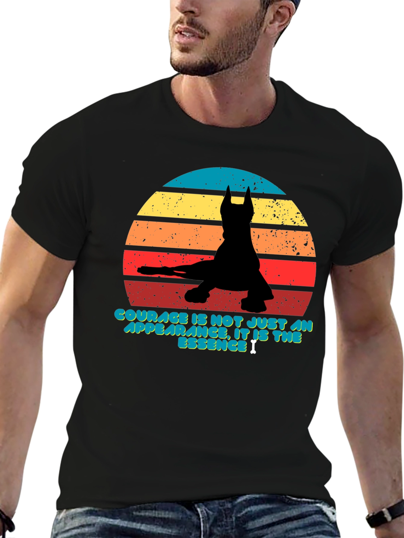 Show off your inner strength with this unique T-shirt. This black tee features a vintage-style sunset graphic with a bold dog silhouette. Emblazoned with the empowering message: "Courage is not just an appearance, it is the essence," this shirt is perfect for anyone who values bravery and inner strength. Made from comfortable fabric, this tee is ideal for casual wear. Whether you're hitting the gym, running errands, or just relaxing at home, this shirt is a stylish way to express your values. A great gift for dog lovers, motivational enthusiasts, and anyone who appreciates a touch of vintage flair.