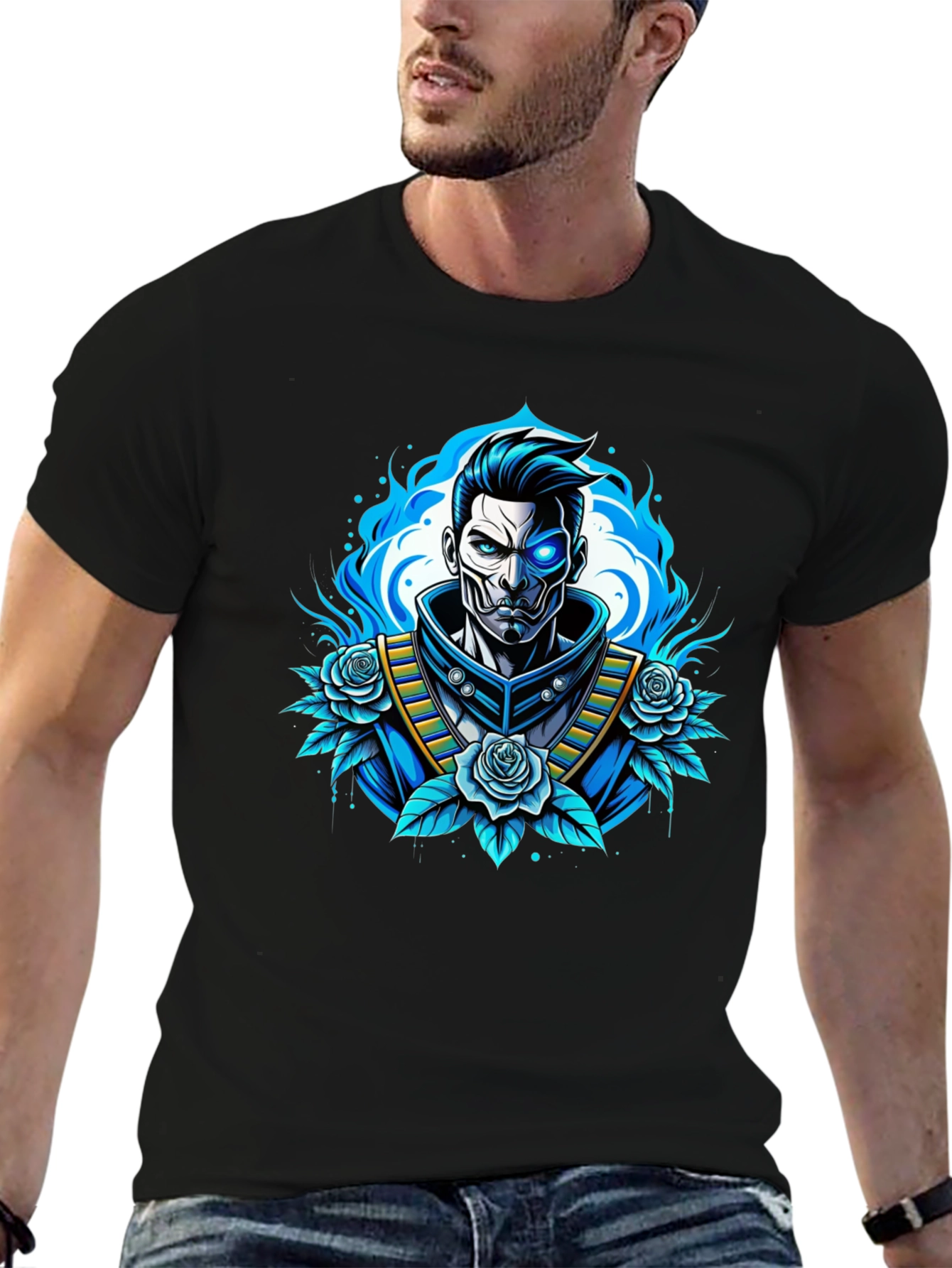 Unleash your inner warrior with this striking black t-shirt featuring a futuristic cyberpunk samurai design. The artwork showcases a half-robotic, half-human warrior surrounded by vibrant blue flames and detailed blue roses. The intricate details of the character's face, armor, and the swirling flames create a visually stunning effect. Made from comfortable, breathable fabric, this tee is perfect for everyday wear or as a statement piece at your next event. Ideal for fans of cyberpunk, samurai culture, and unique graphic designs. Add a touch of edgy style to your wardrobe with this eye-catching t-shirt.