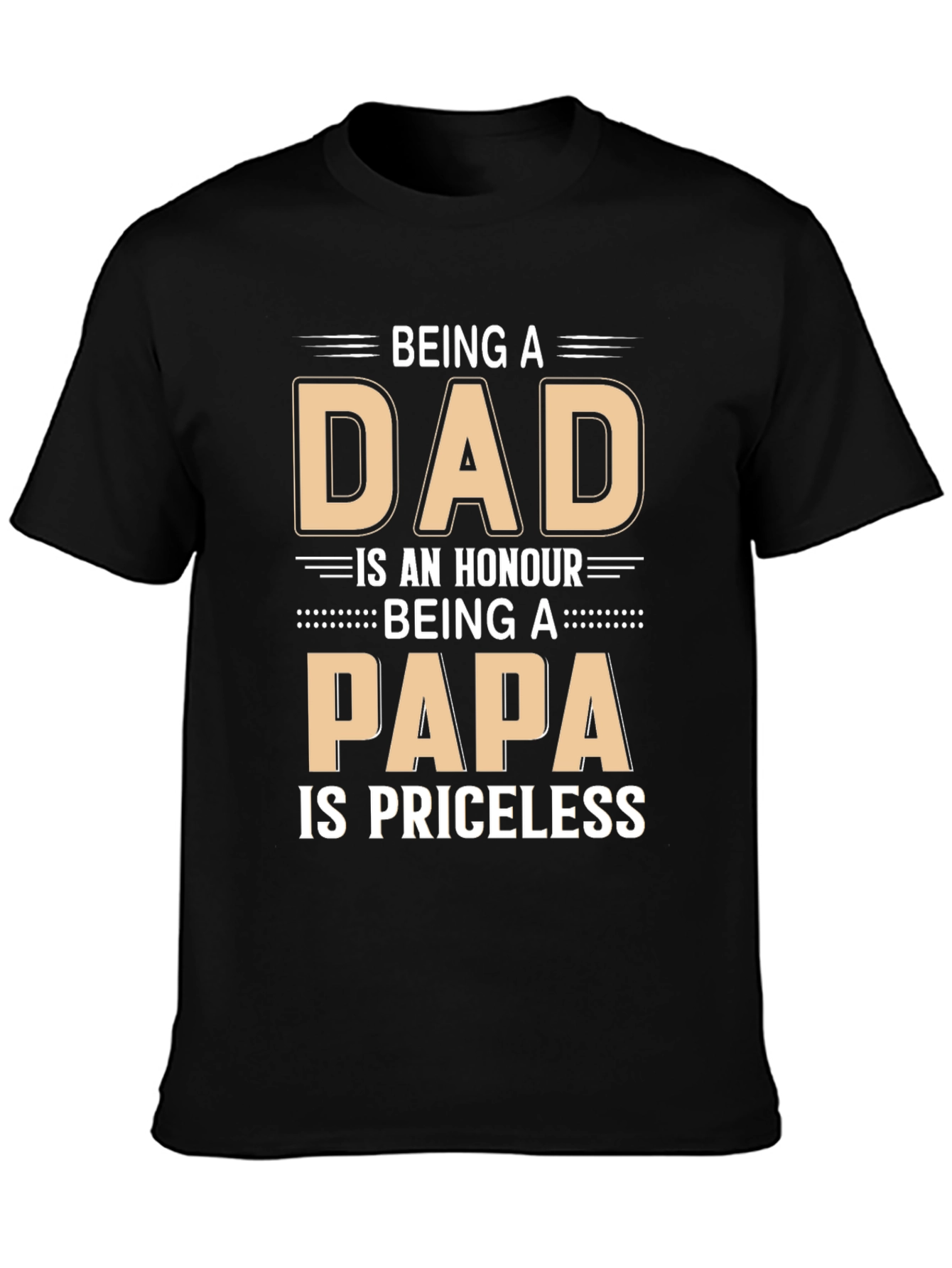 Show your love with this "Being a Dad is an Honour Being a Papa is Priceless" black t-shirt. The tee features a playful design with a stylish beige font for 'DAD' and 'PAPA', complemented by white text details. Made from comfortable fabric, it's perfect for casual wear, family outings, or as a thoughtful gift for Father's Day or birthdays. Wear your title with pride!