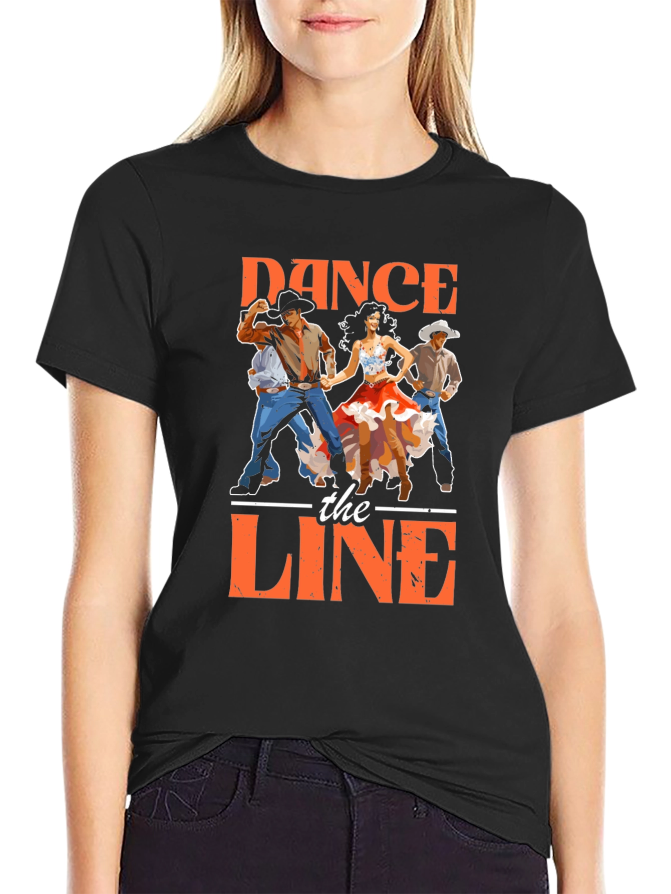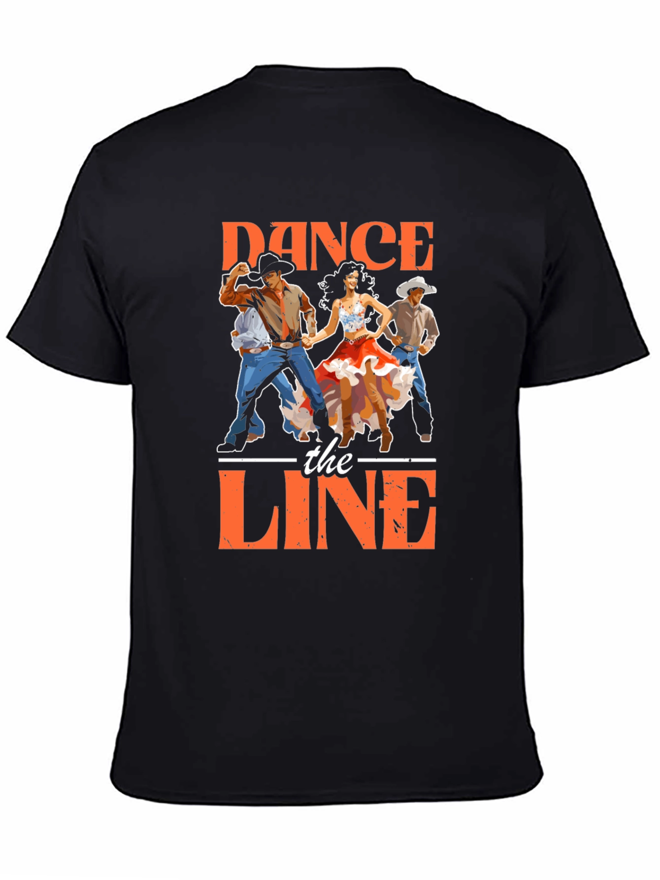 Get ready to dance the line in this eye-catching graphic tee! This black T-shirt features a vibrant print of line dancers and bold lettering. Made from a comfortable-looking fabric, it's perfect for casual wear or showing off your love for country dancing. The colorful print is sure to turn heads, making it a great conversation starter. Wear it to your next line dancing class, a country-themed party, or just for everyday style. This T-shirt is a must-have for any fan of country music and line dancing!
