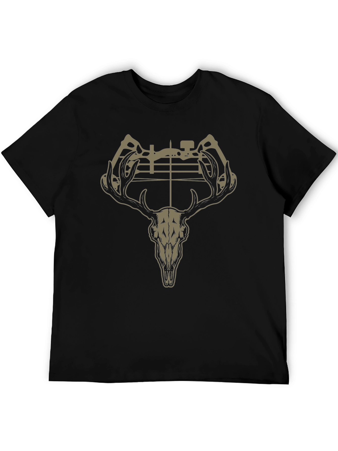 Showcase your passion for hunting with this unique graphic t-shirt. The design features a striking deer skull overlaid with a bow and sight, creating a bold and eye-catching statement. Made from comfortable black fabric, this tee is perfect for casual wear, hunting trips, or outdoor adventures. The intricate design and relaxed fit make it a must-have for any hunting enthusiast's wardrobe. Gear up and express your love for the sport with this stylish and durable t-shirt.
