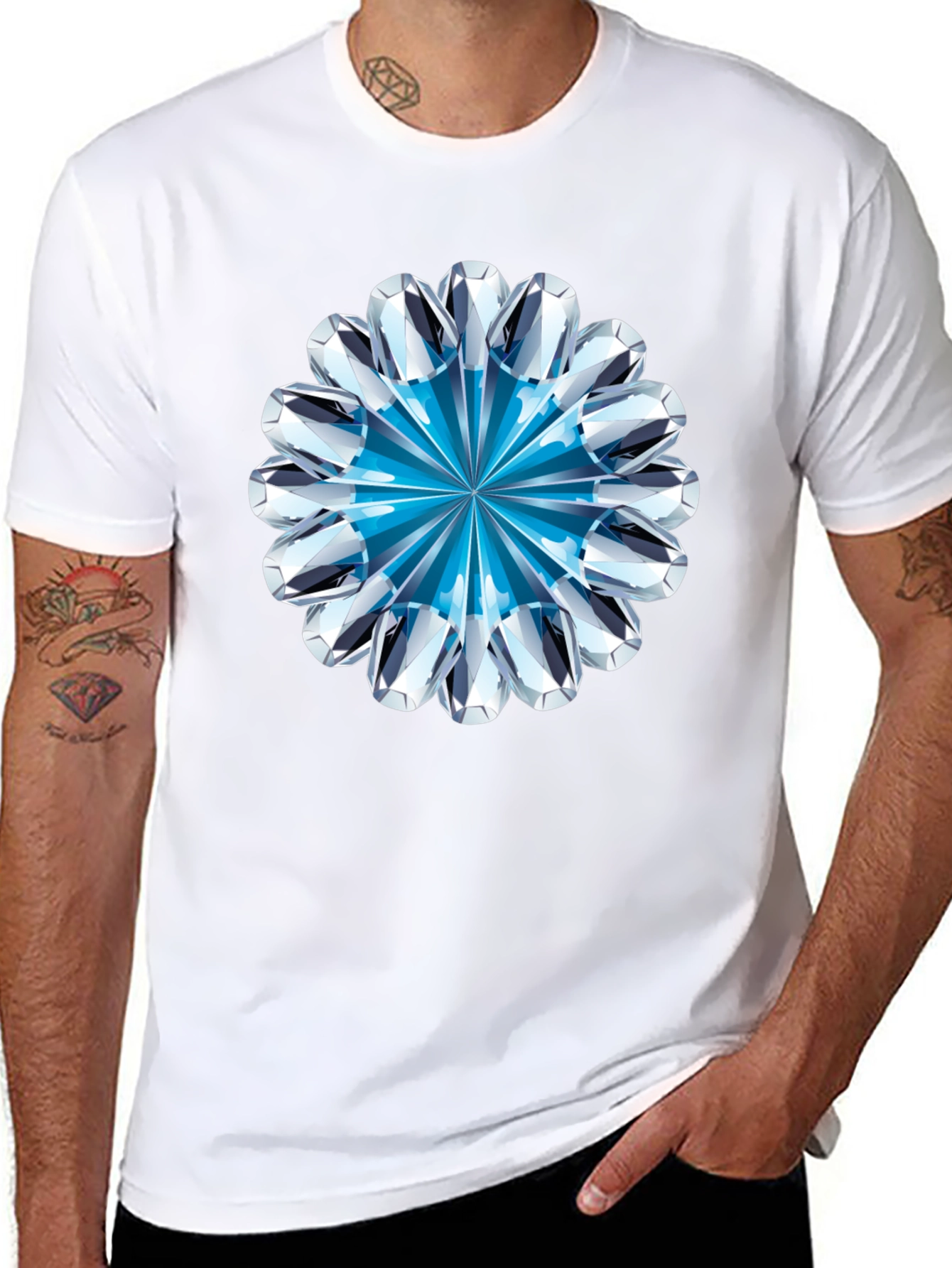 Elevate your casual style with this eye-catching black t-shirt. The shirt features a vibrant, large graphic of a diamond flower design, showcasing brilliant blue and clear gemstone petals radiating from the center. This striking image is sure to turn heads and add a touch of luxury to your everyday look. Made from soft, breathable fabric, this t-shirt offers both comfort and style. Perfect for casual outings, weekend adventures, or simply lounging at home, this tee is a versatile addition to any wardrobe. Pair it with jeans, shorts, or a skirt for a fashionable statement. Make a statement with this unique graphic tee!