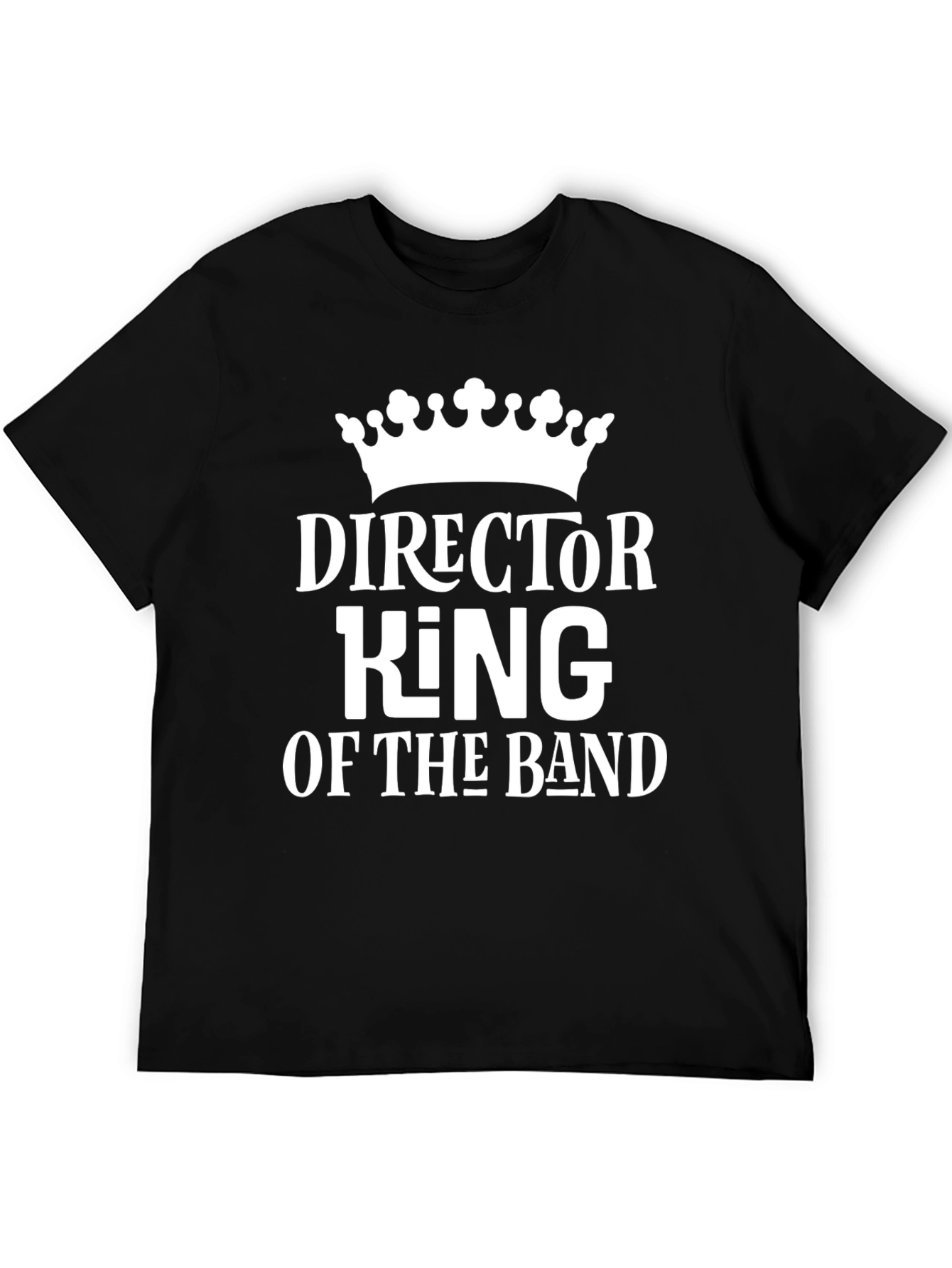 Declare your domain with this bold "Director King of the Band" black t-shirt. This eye-catching tee features a stylish white crown graphic above the text, making a statement with any outfit. The classic crew neck and short sleeves offer a comfortable and relaxed fit, perfect for casual wear. Show off your passion for music leadership or gift it to the special director in your life! Made with comfortable, breathable fabric to stay cool and comfortable all day long.