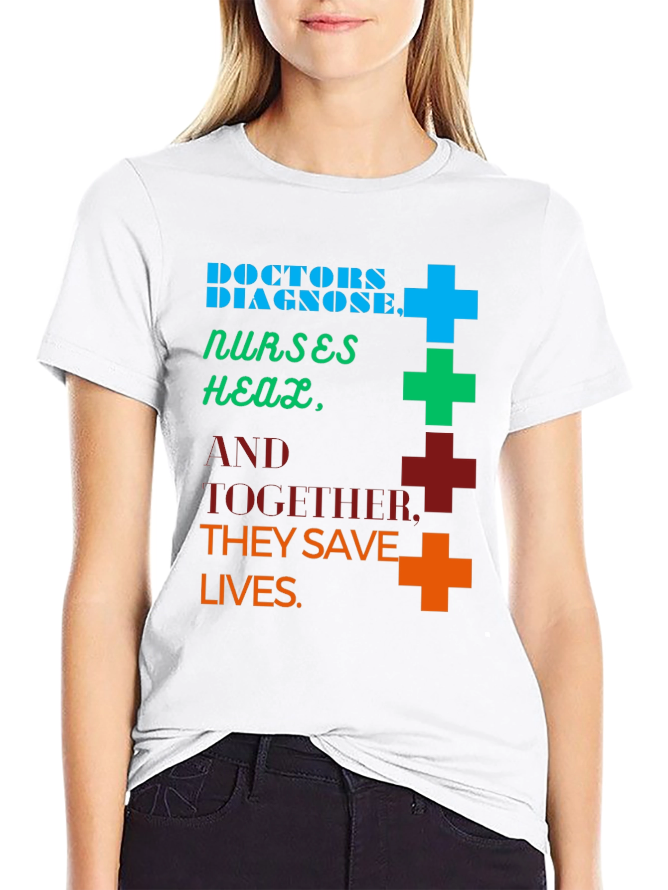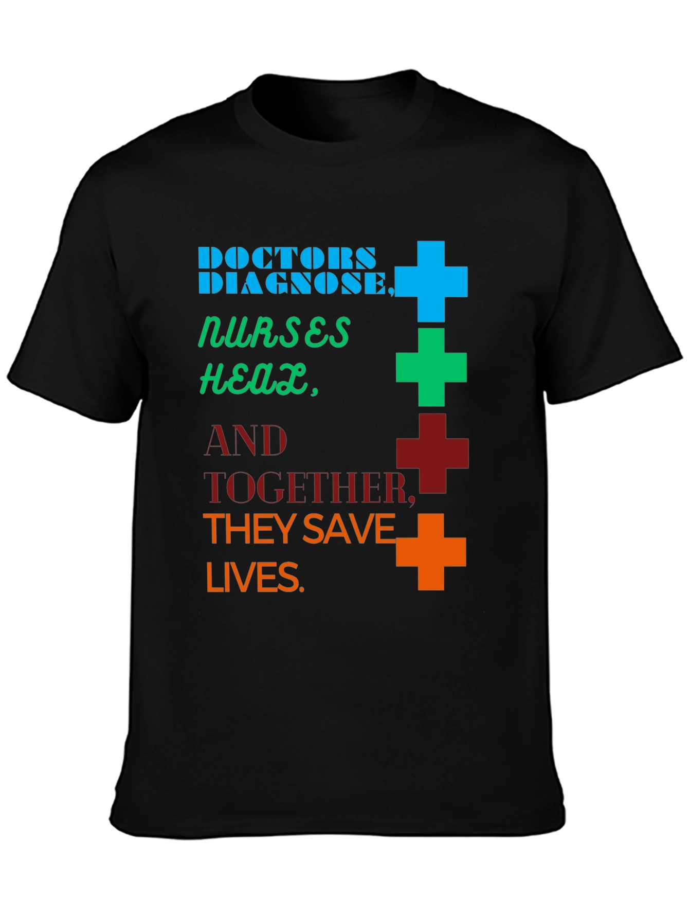 Show your appreciation for healthcare heroes with this stylish black t-shirt. Featuring a bold, colorful design with the phrases "Doctors Diagnose", "Nurses Heal", "And Together, They Save Lives", this tee honors the medical profession. The graphic incorporates blue, green, red, and orange plus signs to add a vibrant pop of color. Made from comfortable, breathable fabric, it's perfect for everyday wear, hospital staff appreciation days, or as a thoughtful gift for the healthcare worker in your life. Wear your support proudly and make a statement with this unique and meaningful tee.