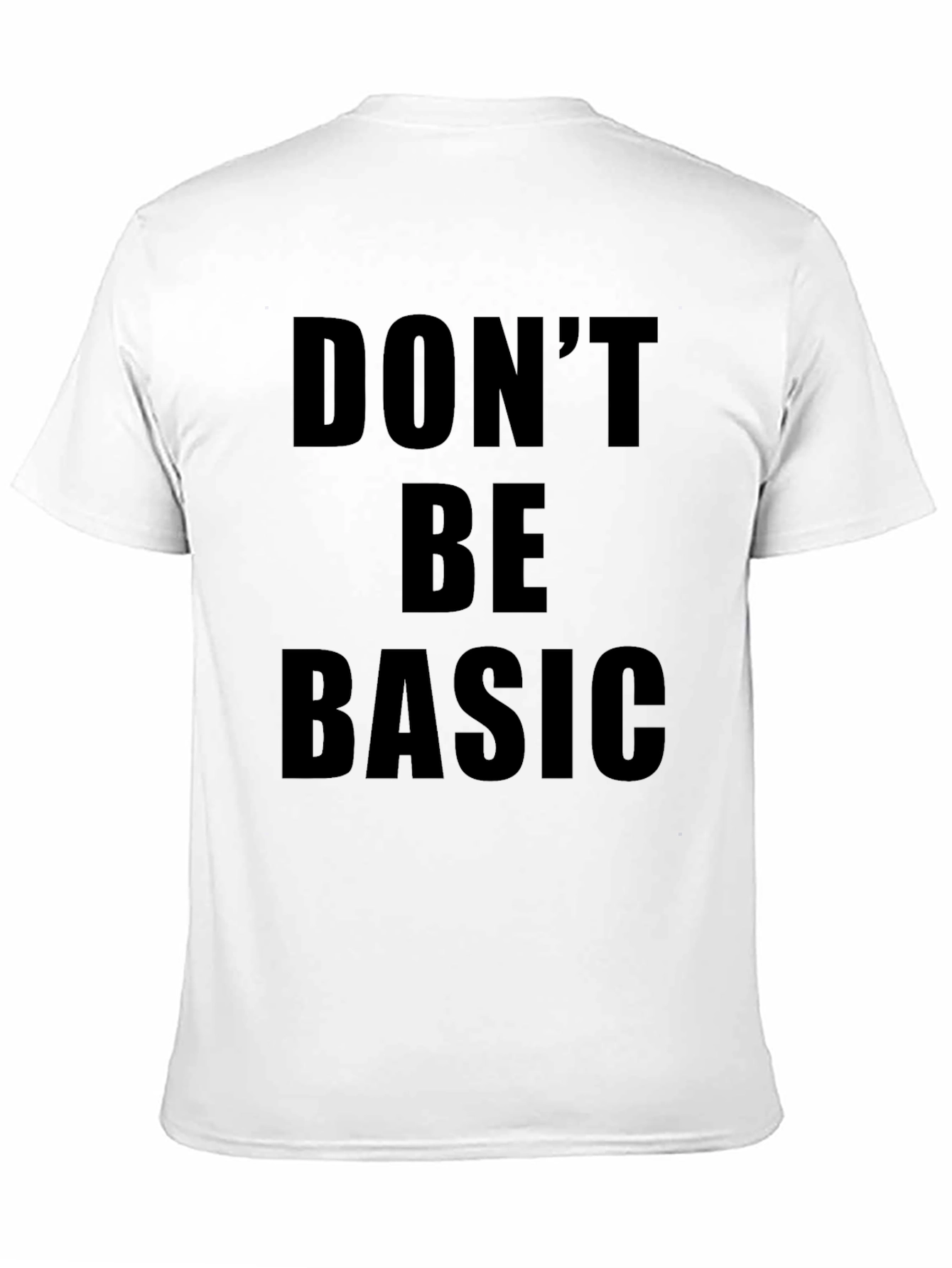 Make a statement with this bold black graphic tee. The shirt features the phrase "DON'T BE BASIC" in large, impactful black lettering across the chest. Constructed from a comfortable-looking fabric, this tee is perfect for everyday wear or for making a statement. The classic fit and short sleeves ensure versatility and comfort. Pair it with jeans, shorts, or joggers for a casual yet stylish look. Show off your unique style and stand out from the crowd with this must-have graphic tee. A great addition to any modern wardrobe, this shirt is sure to get noticed.
