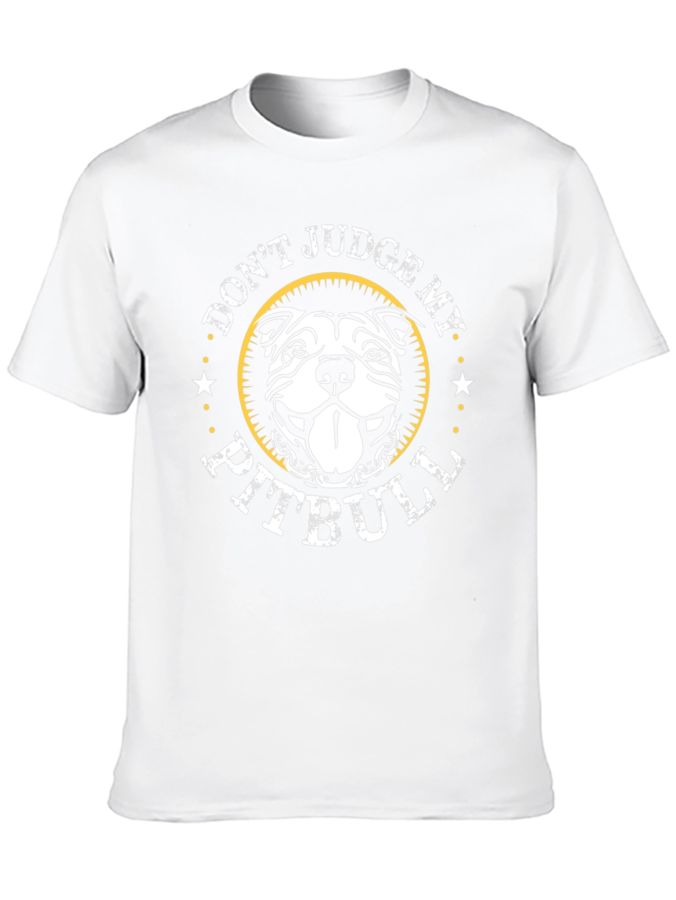 Show off your love for your furry friend with this stylish black tee. Featuring a bold graphic of a smiling pitbull encircled by the phrase "Don't Judge My Pitbull", this shirt is perfect for dog lovers. The design incorporates stars and a striking yellow accent circle. Made from comfortable fabric, this t-shirt is ideal for casual wear, dog walks, or just lounging around. Makes a great gift for any pitbull owner or enthusiast. Get yours today and let your love for pitbulls shine!
