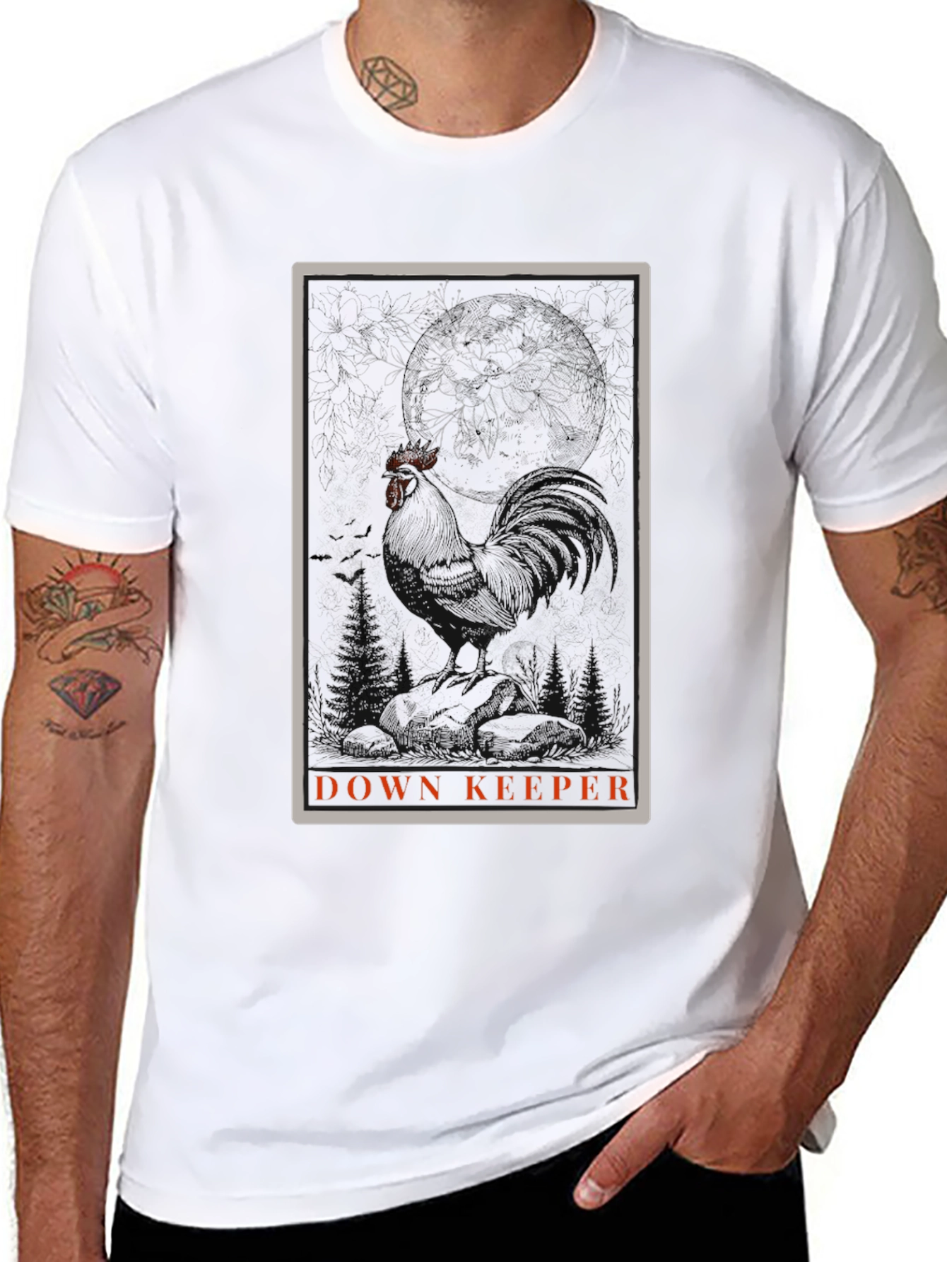 Embrace understated style with this black cotton blend graphic tee. The t-shirt features a vintage-inspired rectangular design with a floral motif. The words "Down Keeper" are displayed in a bold font, adding an edgy touch. Crafted from a comfortable cotton blend, this tee is perfect for everyday wear. Pair it with jeans for a casual look or dress it up with chinos for a night out. Express your individuality with this must-have wardrobe staple. The durable fabric ensures lasting wear and easy care.