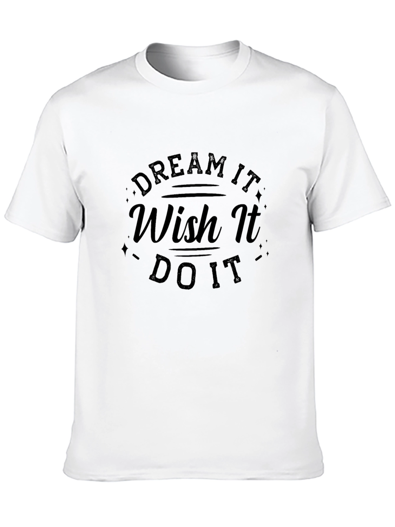 This black t-shirt features a circular design with the words "Dream It, Wish It, Do It" printed in a stylish font. The classic fit makes it versatile for everyday wear. Crafted from comfortable fabric, this tee offers both style and ease. Ideal for casual outings, workouts, or lounging at home, this inspirational t-shirt will be your new wardrobe staple. Get yours today!