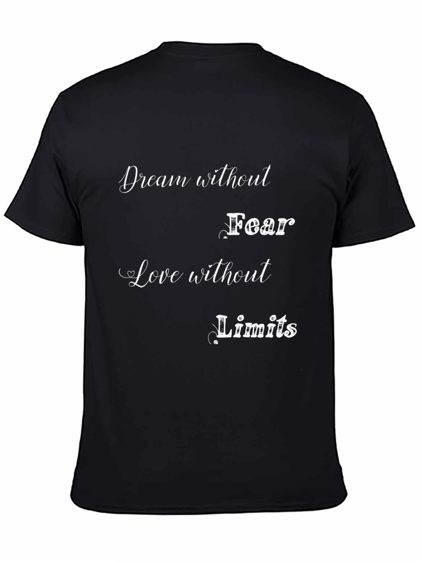 Embrace positivity with this stylish black graphic t-shirt. Made from a comfortable-looking fabric, this tee features the inspiring message "Dream without Fear, Love without Limits" in an elegant white font. The design offers a clean and modern aesthetic, making it perfect for casual everyday wear. Show off your optimistic spirit while staying comfortable. Great for pairing with jeans, shorts, or layering under a jacket. A versatile addition to any wardrobe!