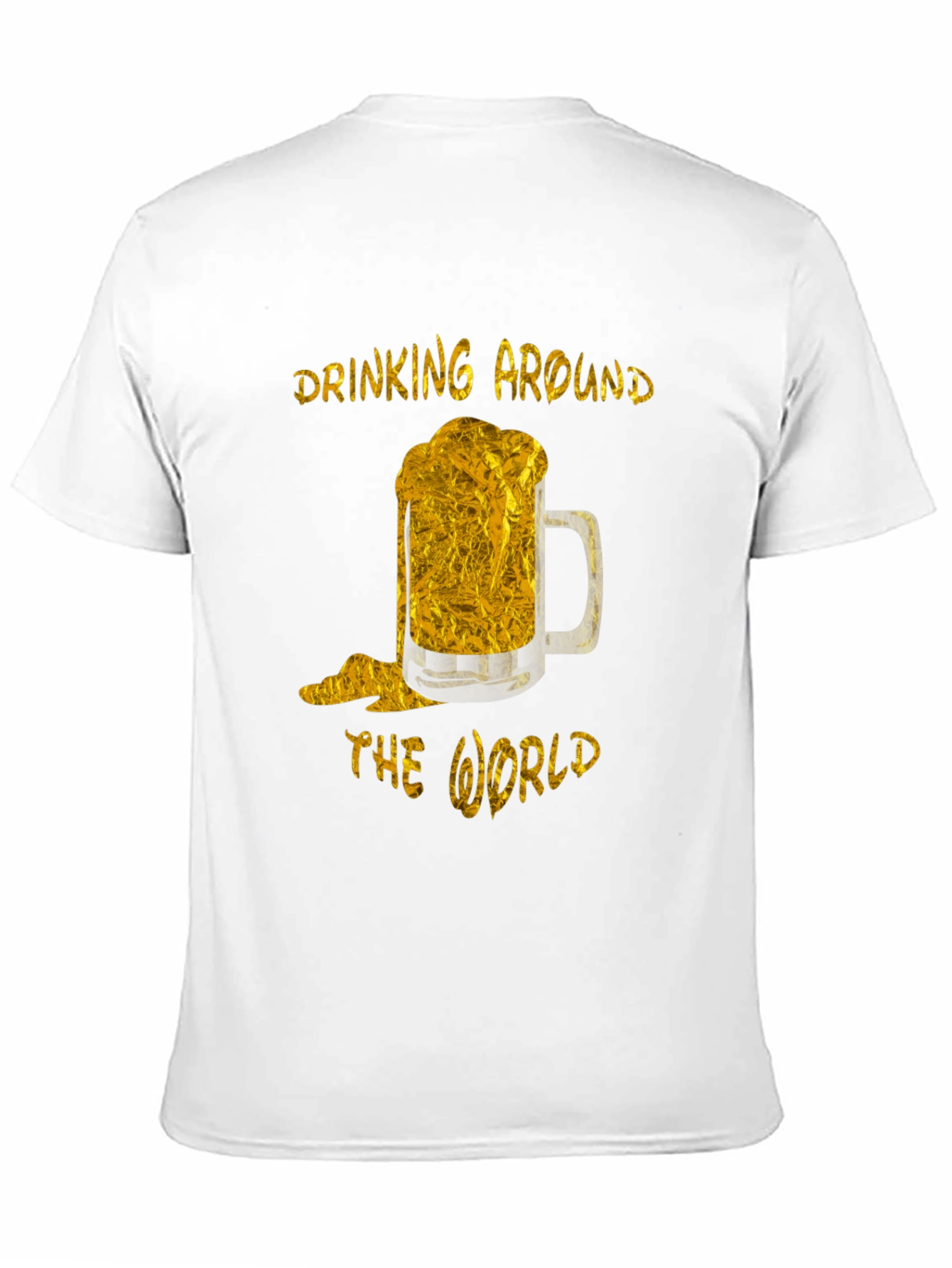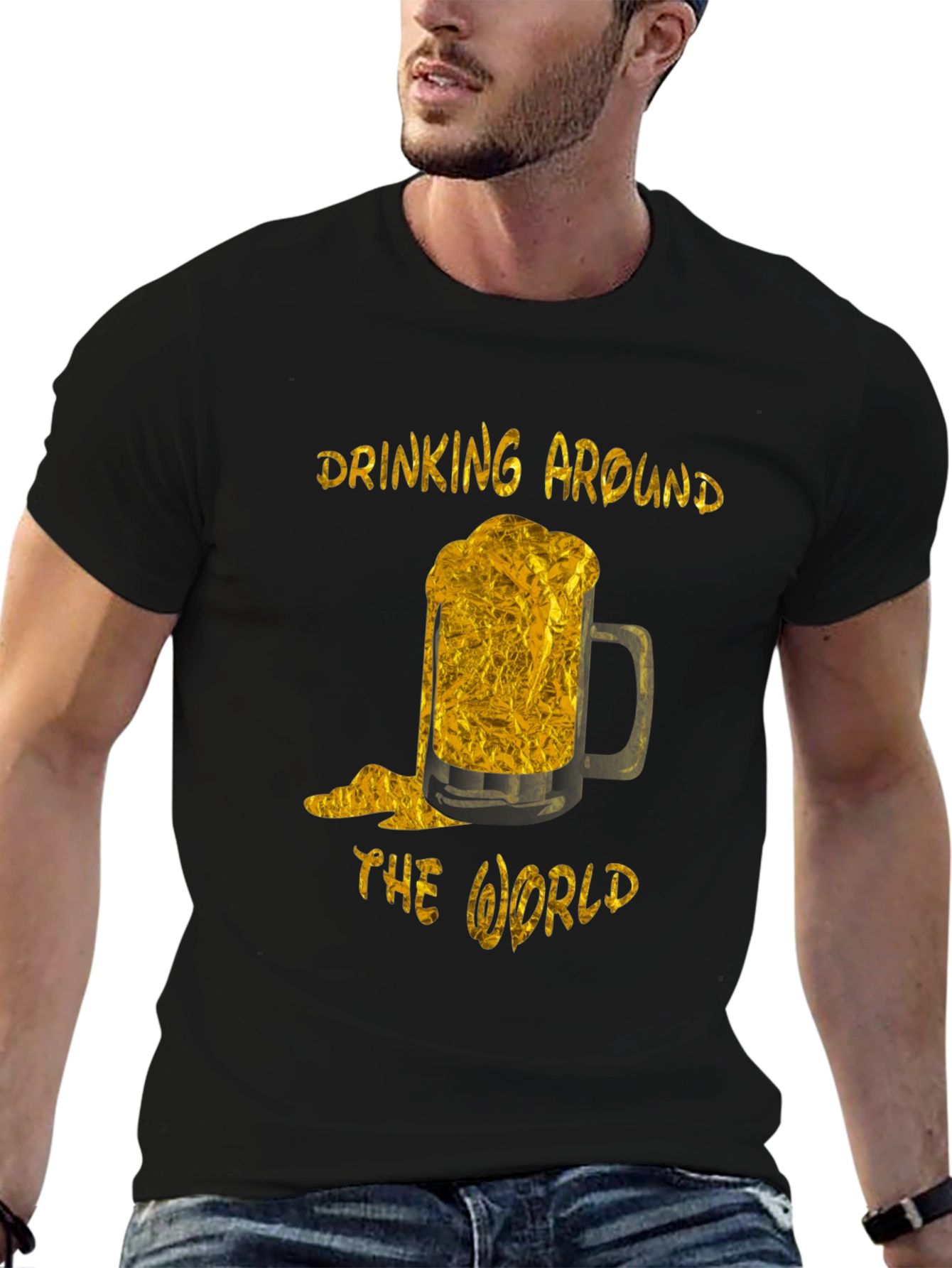 Show off your love for beer with this stylish black t-shirt. The shirt features a golden design of a frothy beer mug. Above and below the mug are the words "Drinking Around The World" also in gold. This tee is perfect for casual outings, parties, or any event where you want to express your fun-loving personality. Made from comfortable materials, this t-shirt offers a great fit and long-lasting wear. Get ready to turn heads and spark conversations with this unique and eye-catching design. A must-have for beer enthusiasts and world travelers alike!