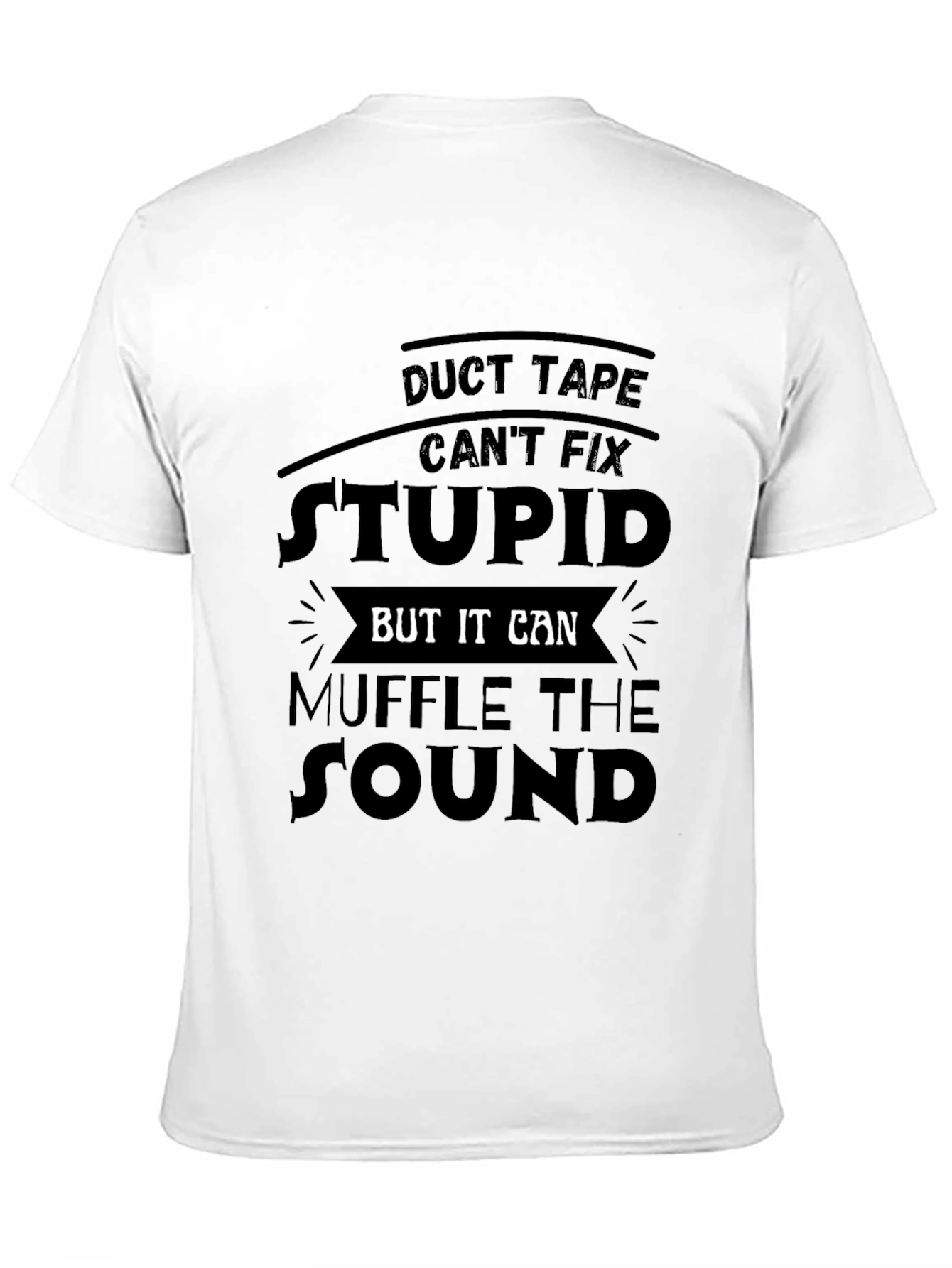 This black tee features a humorous graphic design. The print states, "Duct tape can't fix stupid, but it can muffle the sound." Made from comfortable material, it's perfect for casual wear, social events, or just lounging at home. The t-shirt's bold print is sure to spark conversation. Wear it to express your sense of humor and unique style! Easy to care for and durable, this tee will become a favorite in your wardrobe. Get yours today!