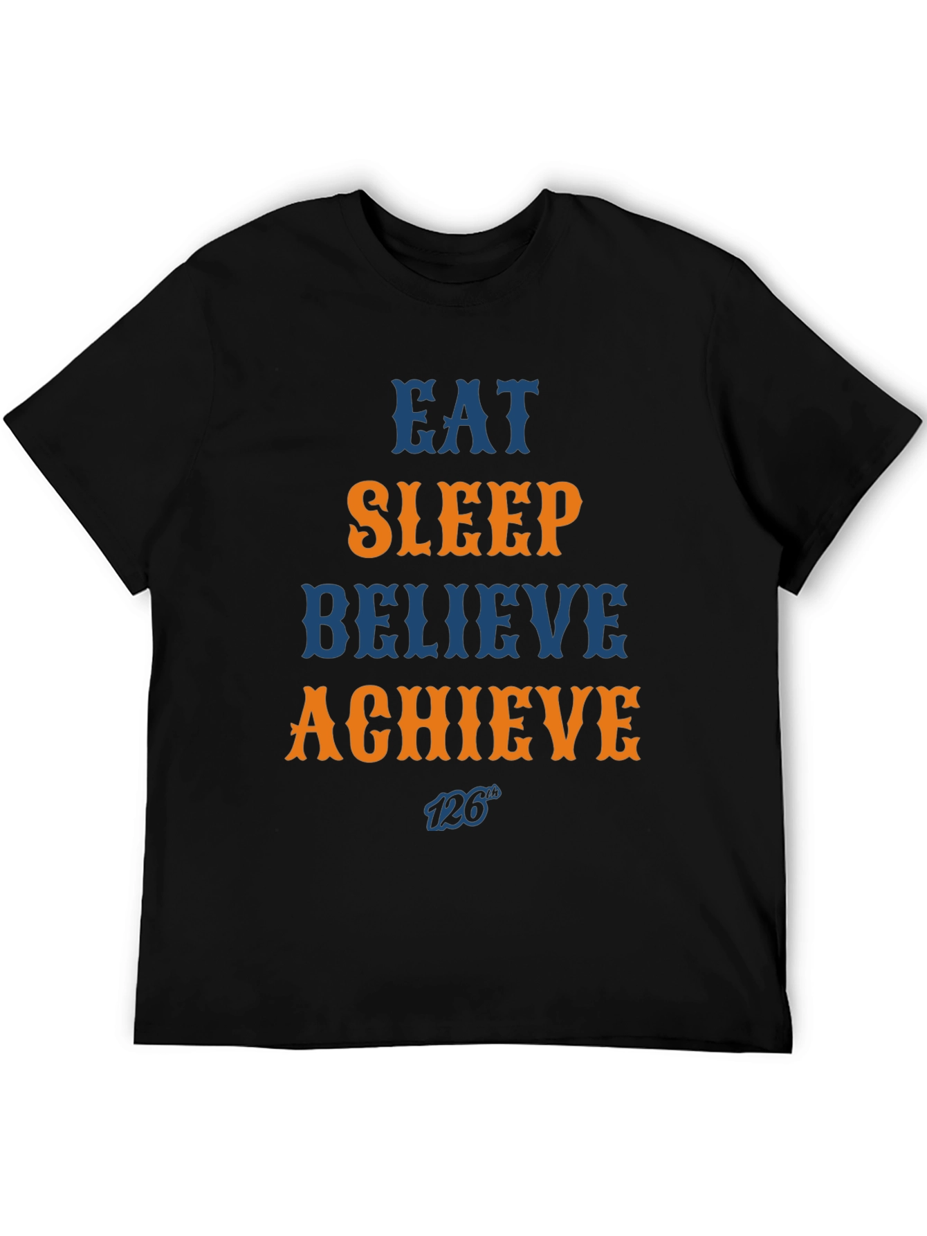 This stylish black t-shirt features a bold, stacked text design with the words "EAT", "SLEEP", "BELIEVE", and "ACHIEVE" in alternating blue and orange colors. The tee is made from what appears to be a soft and comfortable cotton blend. The graphic design makes this shirt a standout piece. Perfect for casual wear, workouts, or everyday style, this t-shirt adds a touch of motivation to any outfit. Get yours today!