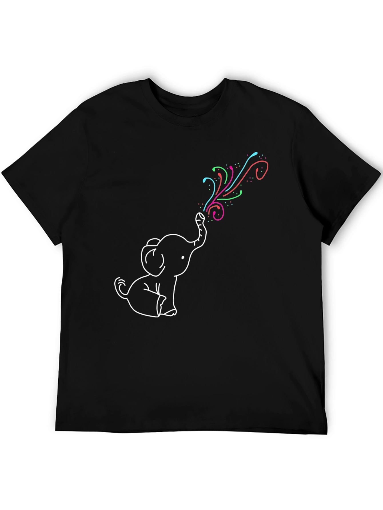 This black t-shirt features a charming graphic of a cute, cartoon-style elephant blowing a colorful rainbow from its trunk. The design is simple yet eye-catching, making it a fun and playful addition to your wardrobe. Made from a soft, comfortable fabric, this tee is perfect for everyday wear. Ideal for casual outings, lounging at home, or as a unique gift for elephant lovers. Pair it with jeans, shorts, or leggings for a relaxed and stylish look. Show off your fun side with this whimsical elephant rainbow t-shirt!
