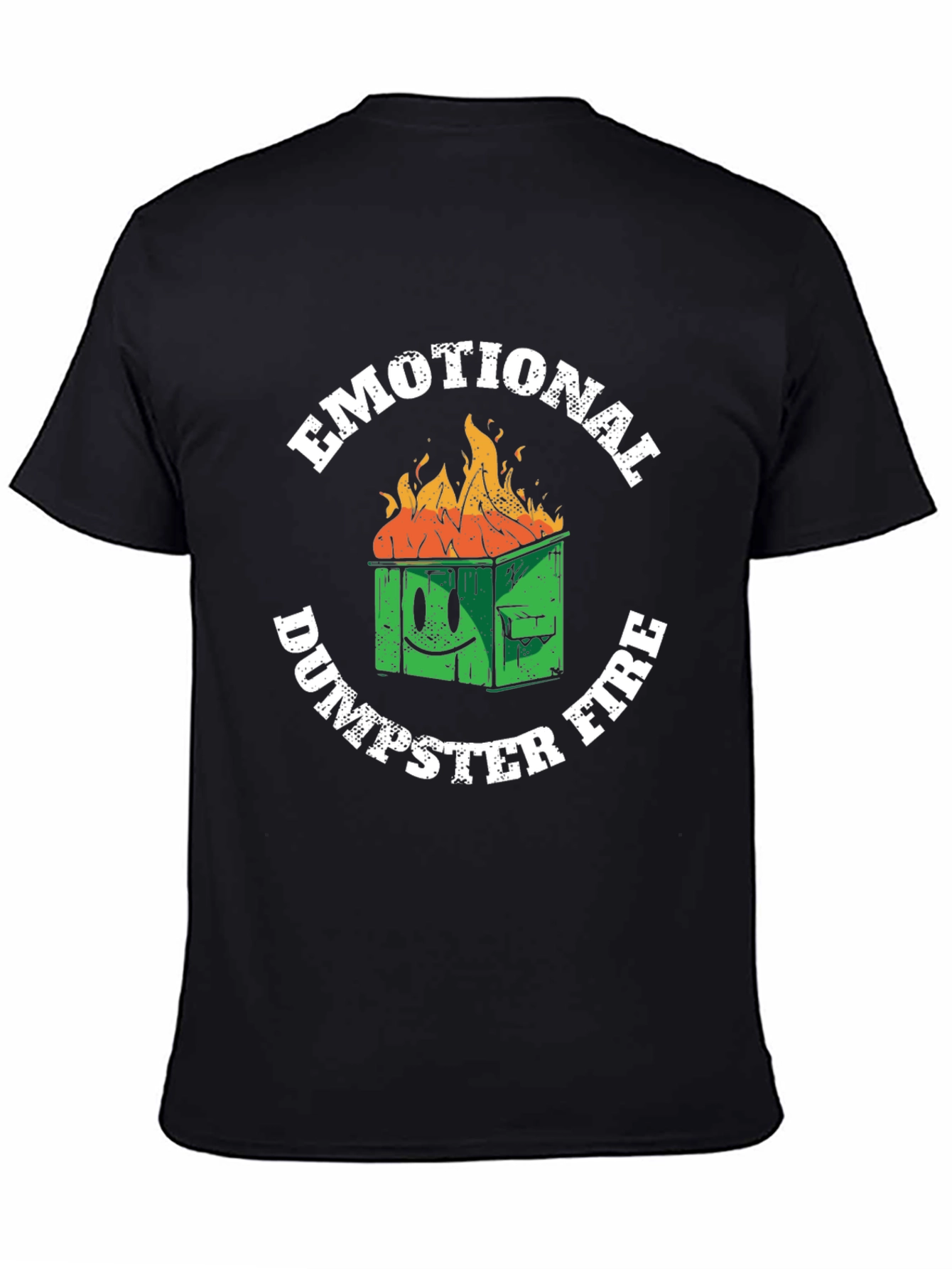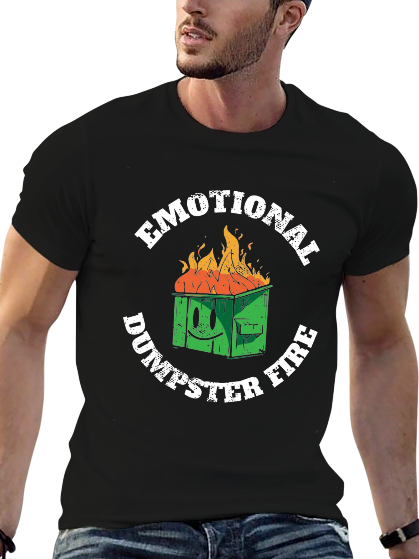 Express your inner feelings with this fun Emotional Dumpster Fire T-shirt! This black tee features a bold graphic design with a dumpster engulfed in flames. The words "Emotional Dumpster Fire" encircle the image in a distressed font for a vintage look. Made from a comfortable and breathable fabric, this shirt is perfect for everyday wear. Whether you're lounging at home or out with friends, this unique tee will be sure to turn heads and spark conversations. Show off your sense of humor with this expressive and stylish T-shirt.