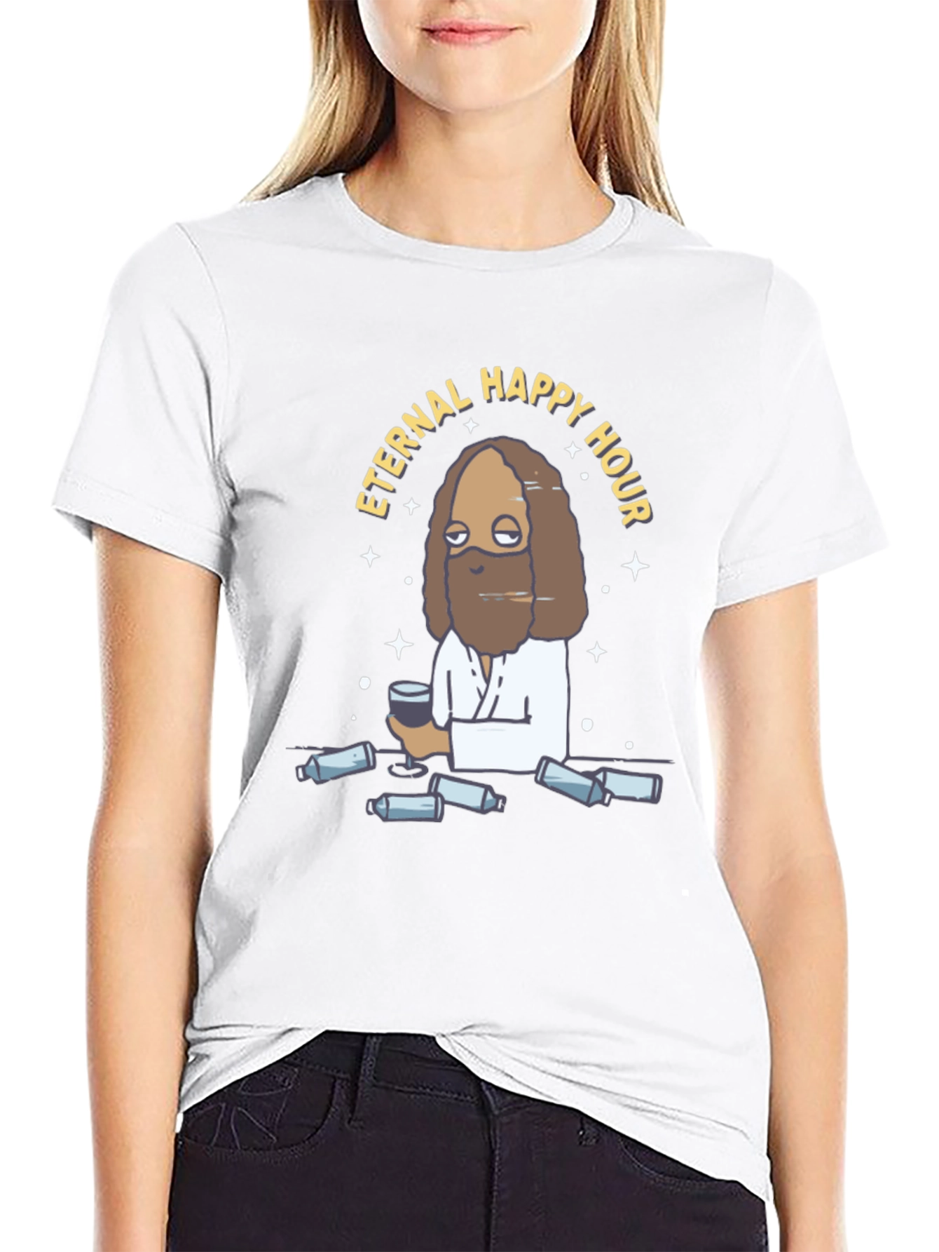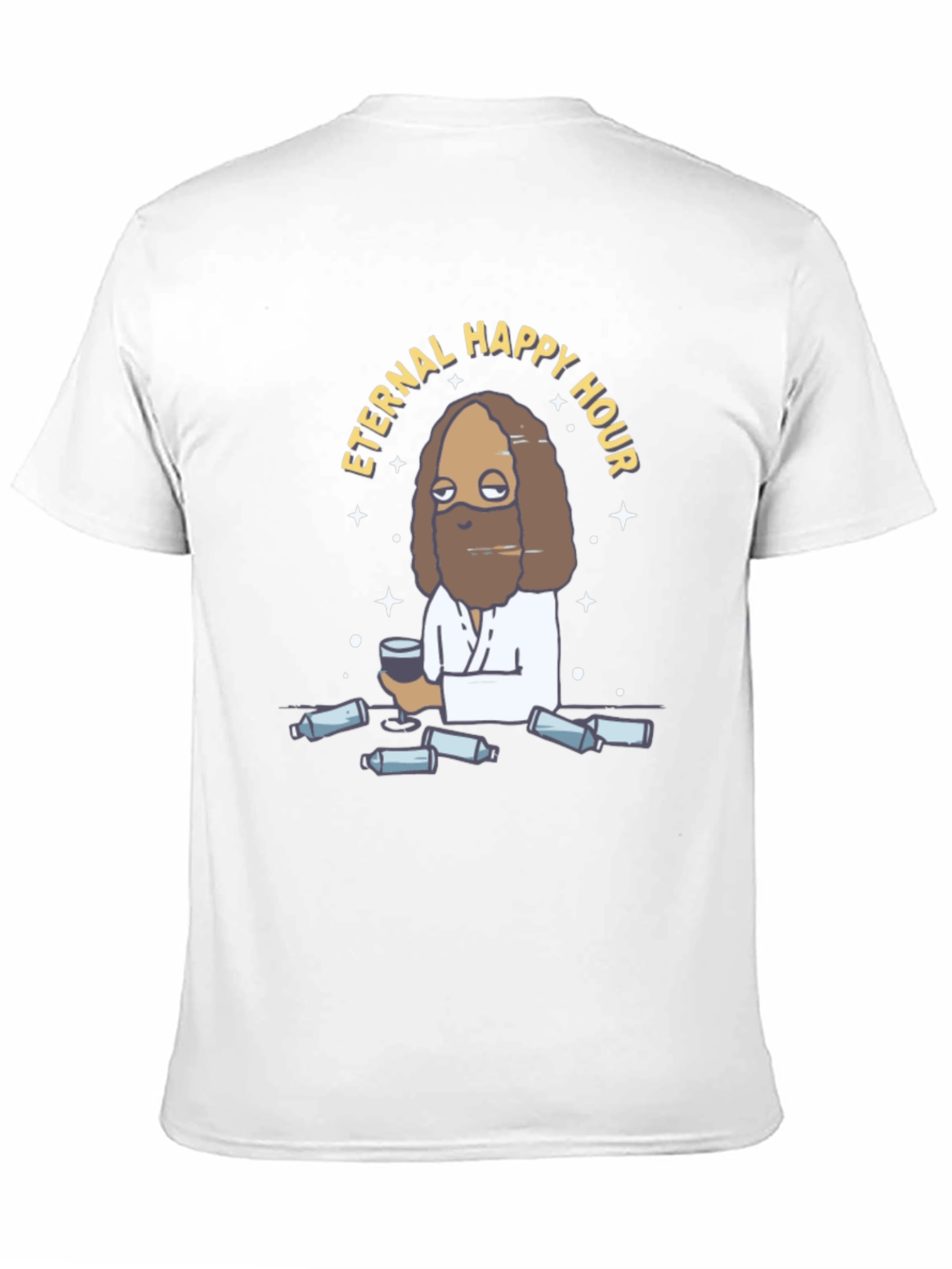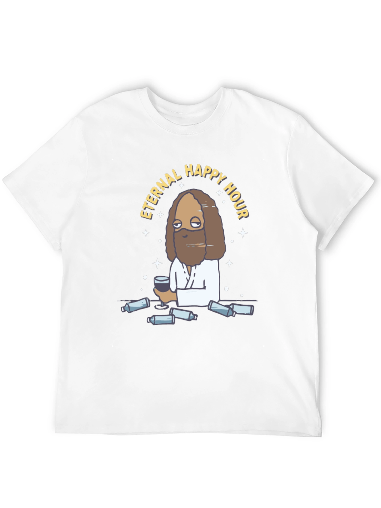 This black tee features a humorous and eye-catching graphic. It depicts a cartoon character resembling Jesus in a relaxed pose, enjoying a drink amidst empty shot glasses. The words "Eternal Happy Hour" arc above the character, adding to the playful vibe. The tee appears to be made from a soft and comfortable material, perfect for everyday wear. It's a great conversation starter and a fun addition to any casual wardrobe. Wear it to parties, social gatherings, or just lounging around at home. This tee is sure to bring a smile to anyone's face. Consider it as a great gift for those with a sense of humor!